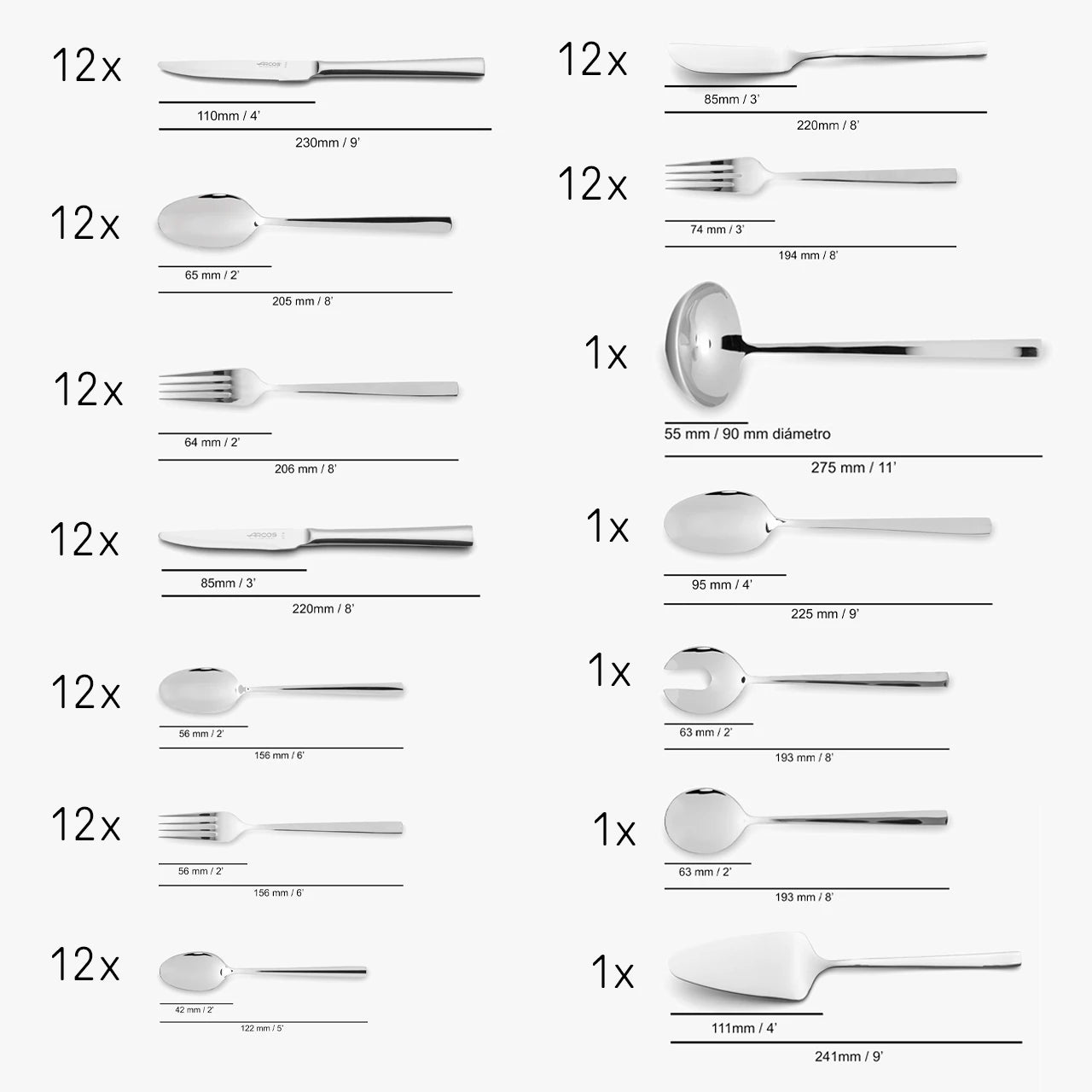 - Es enthält 12 Stücke von jedem Bestecktyp, wie Tafelmesser, Mittag- und Fischmesser Tafellöffel, Kaffeelöffel und Mokkalöffel Tafelgabel, Mittag- und Fischgabel.
