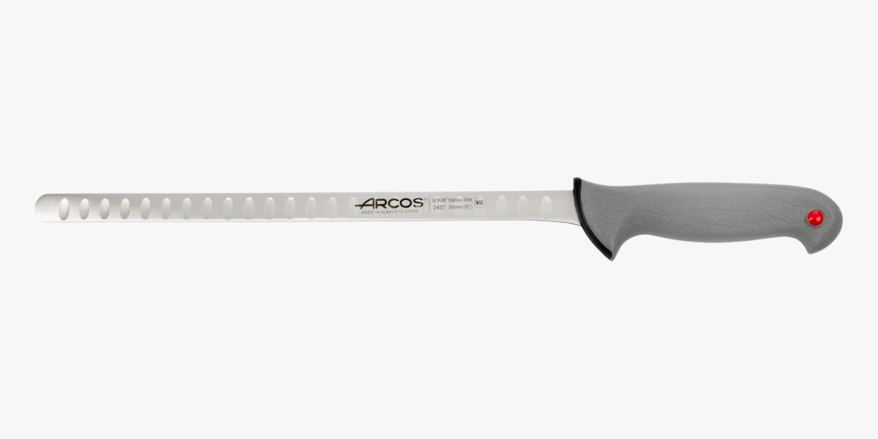 Das Lachsmesser Serie Colour Prof 300 mm von Arcos verfügt über ein spezielles Design, das präzises Schneiden von Lachs in Scheiben erleichtert.