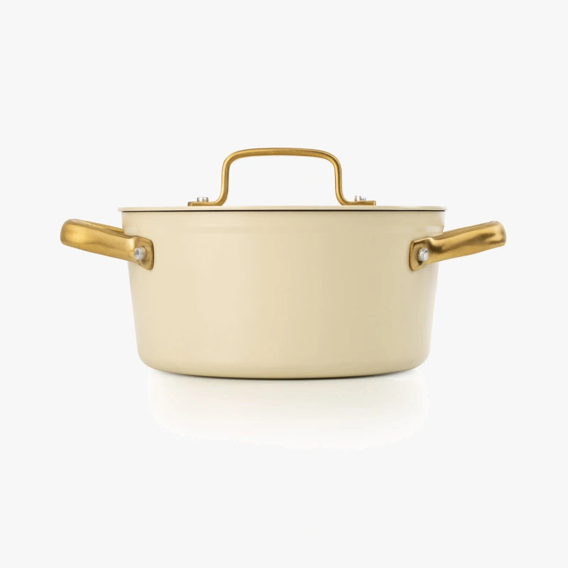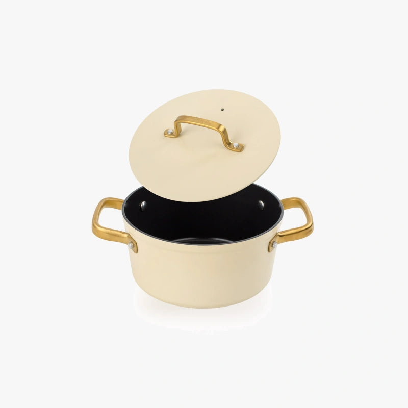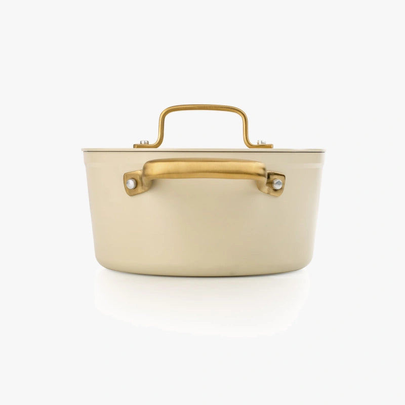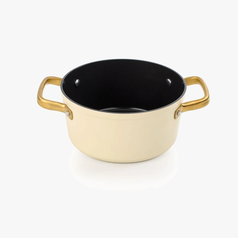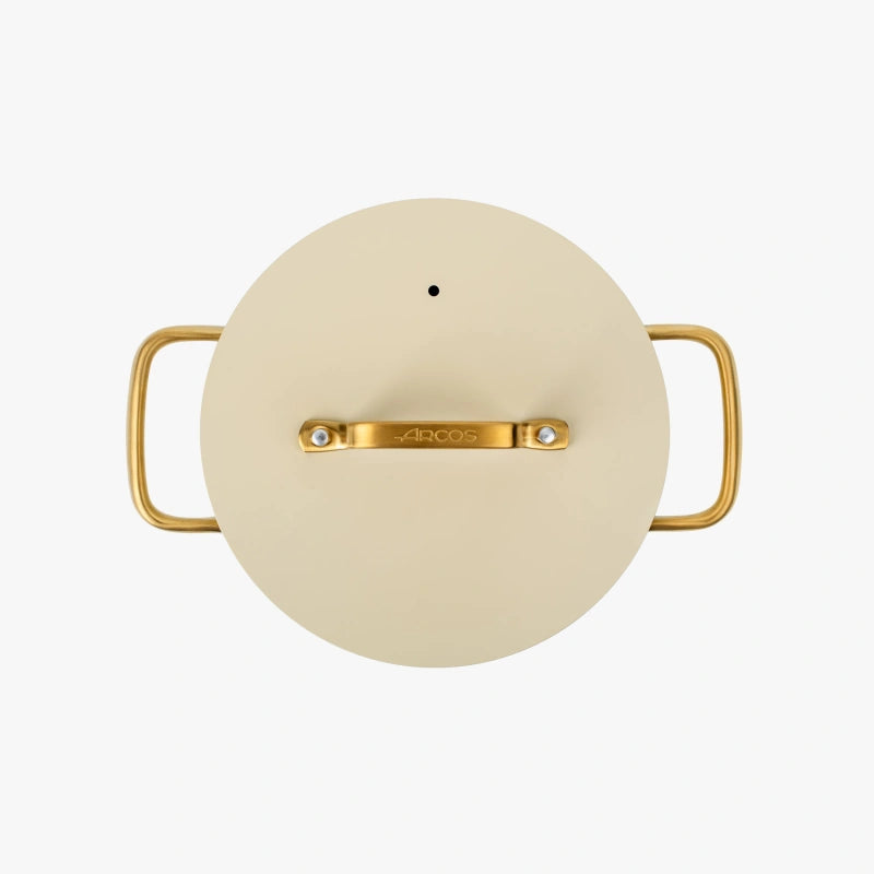 Elegantes Design: Mit ihrem beigen Finish und den goldenen Edelstahlgriffen verleiht diese Kasserolle jeder Küche einen Hauch von Raffinesse.