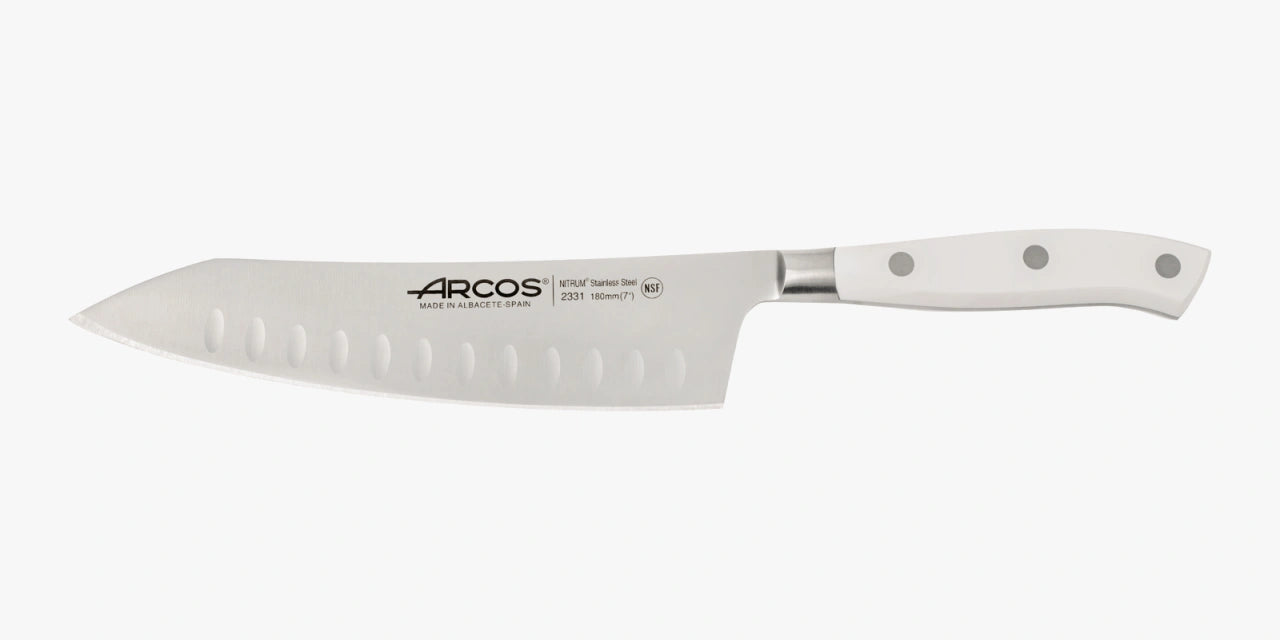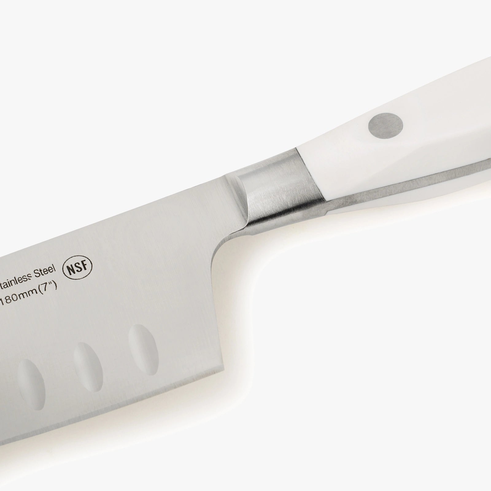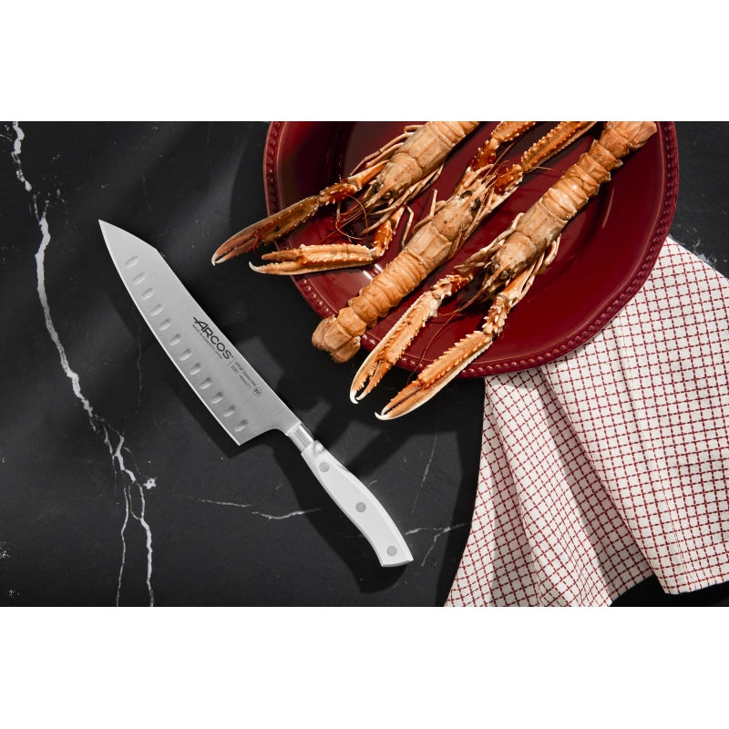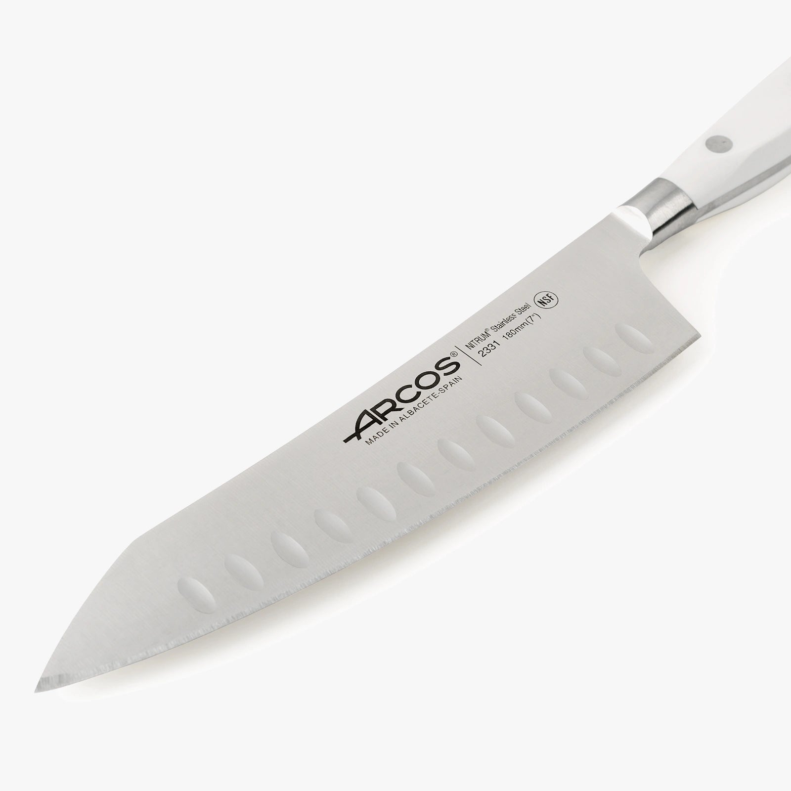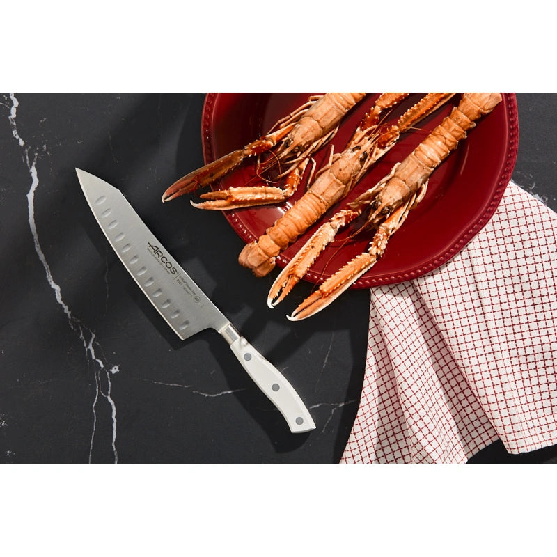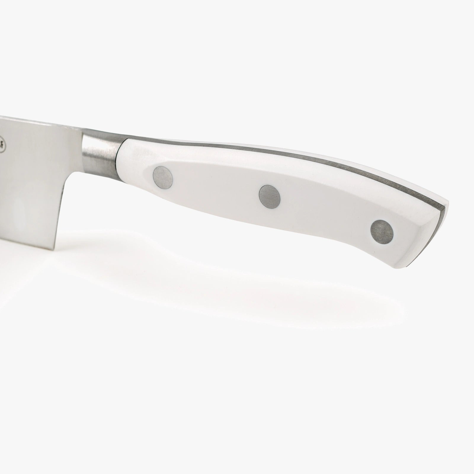 Das Rocking Santokumesser aus der Riviera Blanc Serie hat eine Länge von 18 cm und wird das erste sein, an das Sie denken, wenn Sie mit dem Kochen beginnen. Dank seines ergonomischen Griffs und seiner geschweiften Schneide ermöglicht es schnelles und bequemes Reinigen, Schälen und Schneiden von Obst und Gemüse.