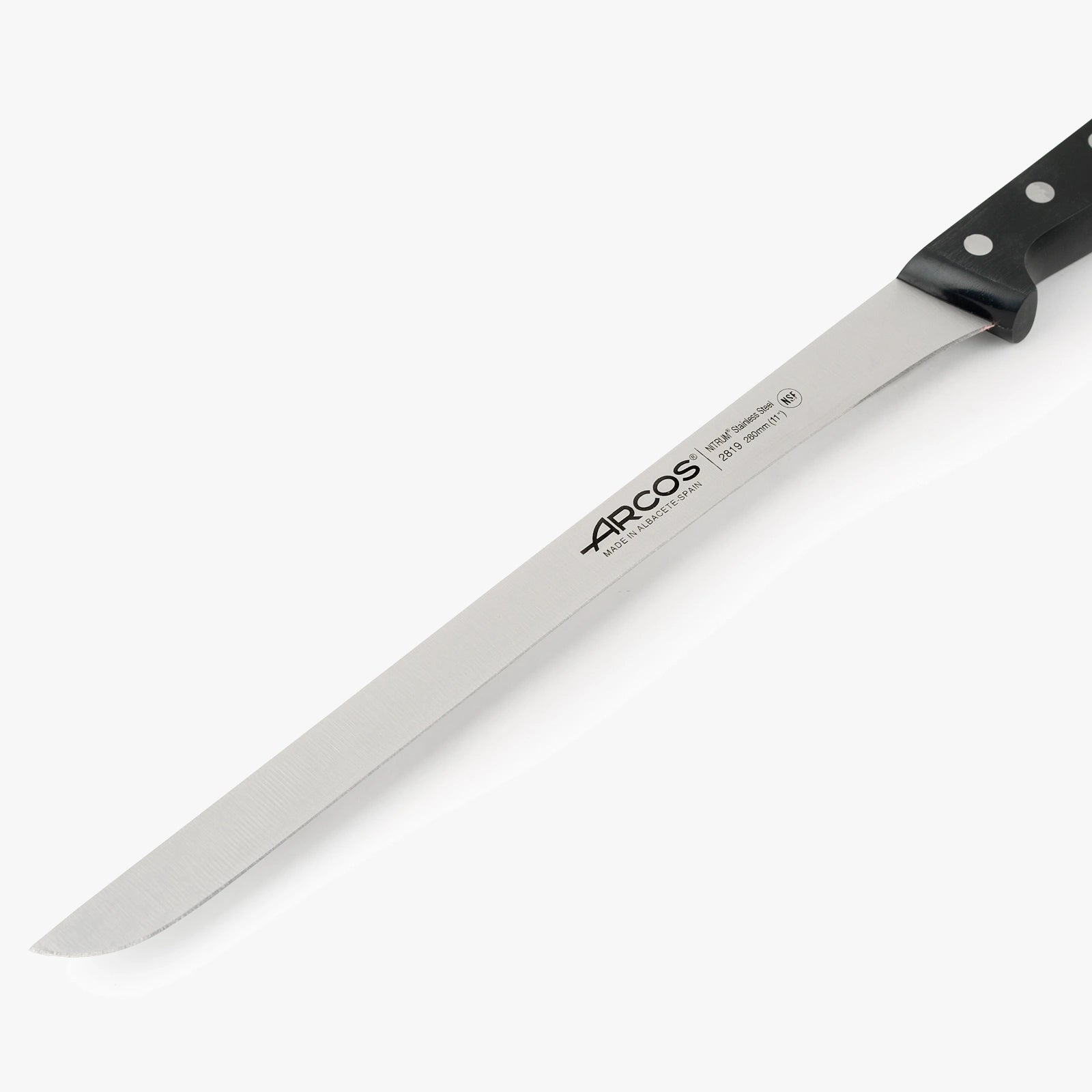 Das Schinkenmesser Serie Universal 280 mm ist speziell zum Entfernen von Fett vom iberischen Schinken konzipiert. Sie können es auch verwenden, um Fleisch zu schneiden. Es verfügt über eine lange, schmale und flexible Klinge, die das Entfernen der Haut erleichtert, während seine glatte Schneide sanft gleitet.