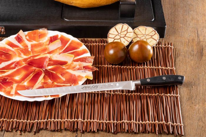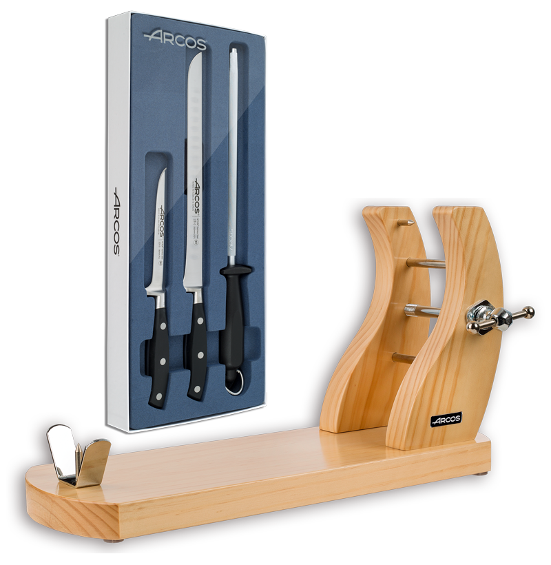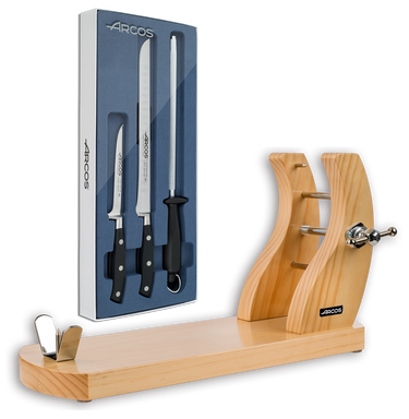 El set jamonero Riviera con soporte para jamón de Arcos tiene un diseño elegante y moderno que facilita el corte del jamón.