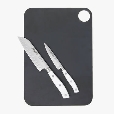 Juego compuesto por un cuchillo Santoku, un cuchillo Montador y una tabla de corte negra. Un set muy práctico para la cocina.