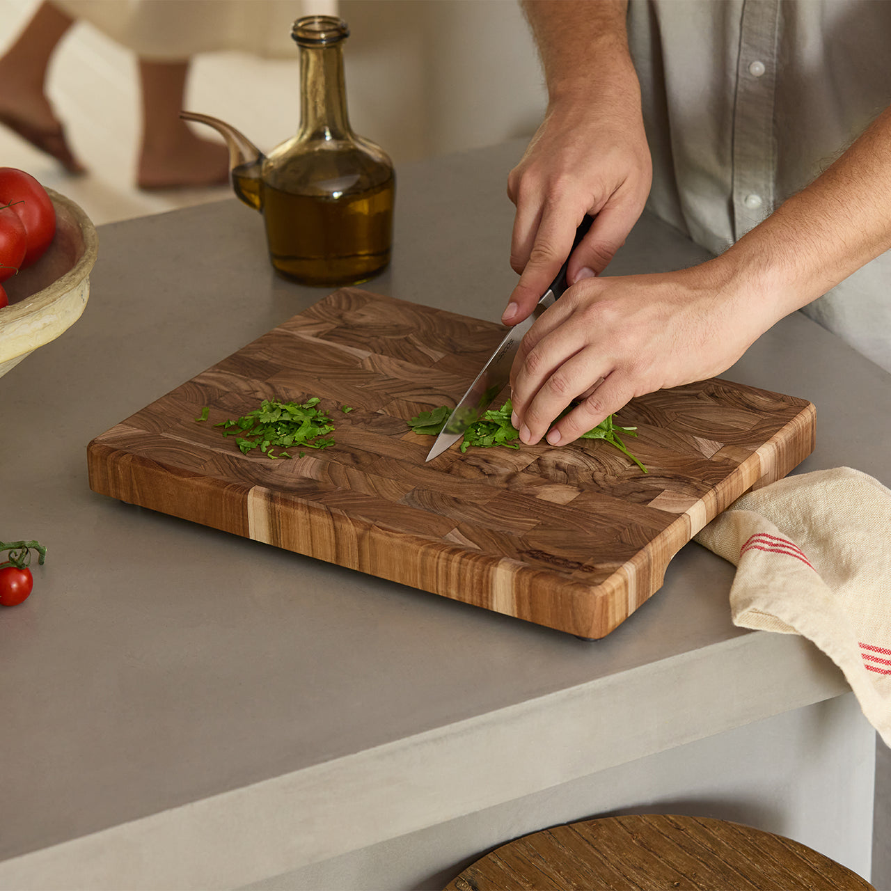 Teakholz, mit seiner kompakten Maserung und einzigartigen warmen Tönen, enthält natürliche Öle, die das Holz schützen und eine Oberfläche bieten, die die Klingen Ihrer Messer schont und jahrelange Nutzung ohne Verlust der Schönheit garantiert.