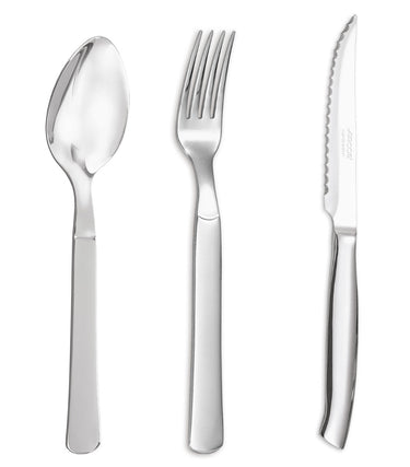 El set de 3 cubiertos de mesa monoblock incluye una cuchara, un tenedor y un cuchillo de acero inoxidable 18/10.