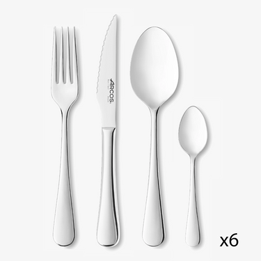 This set consists of 6 pieces: 1 Steak Knife 100 mm, 1 Cafe Spoon 130 mm, 1 Table Fork 200 mm and 1 Luch Spoon 200 mm.