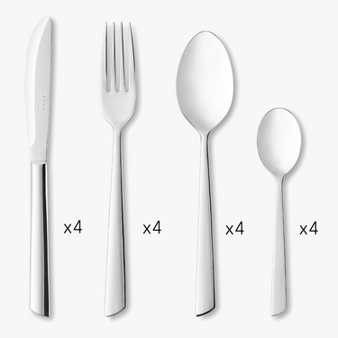- Contains 16 pieces: 4 table knives, 4 table forks, 4 table spoons and 4 coffee spoons.