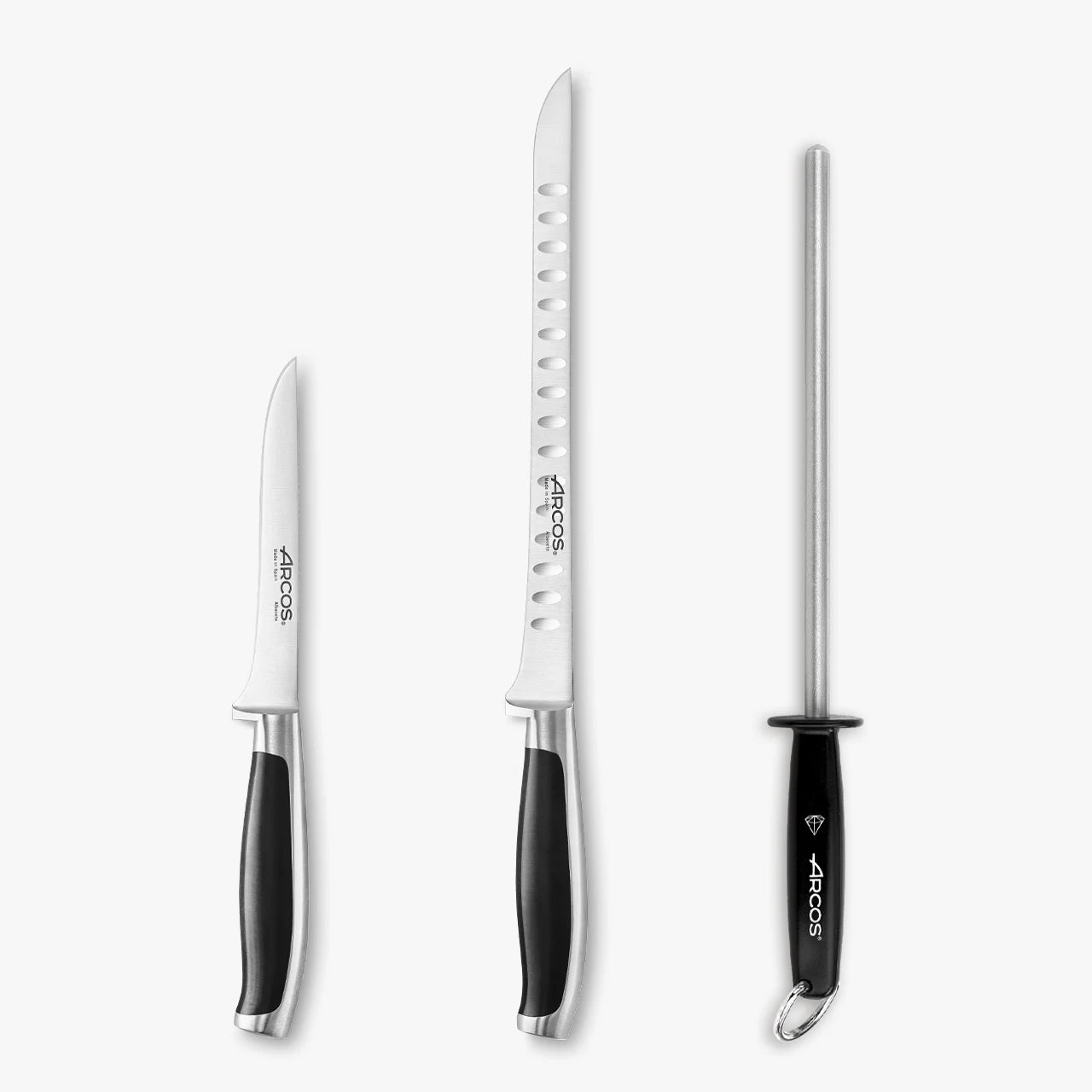 If you want to slice ham like a true professional, this set is made for you. The Kyoto Ham Carving Set brings together the three essential tools used by expert carvers: ham knife, boning knife and sharpening steel. Made in Albacete, Spain, the heart of professional cutlery, it combines craftsmanship with innovative NITRUM® stainless steel technology, exclusive to Arcos.