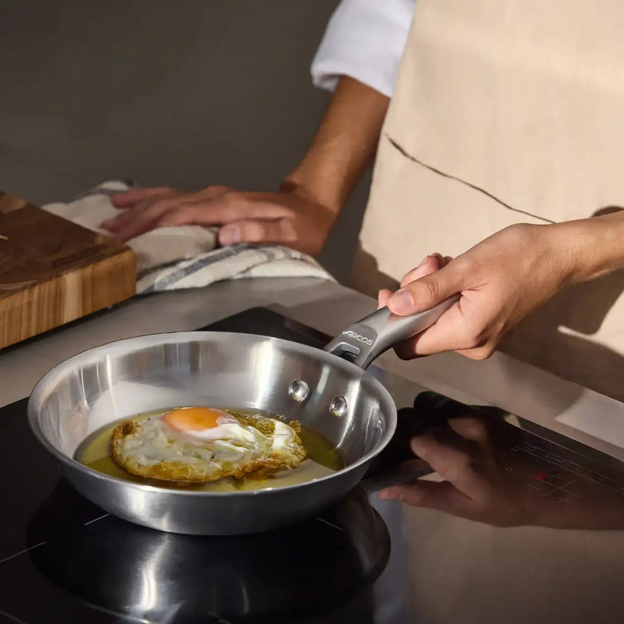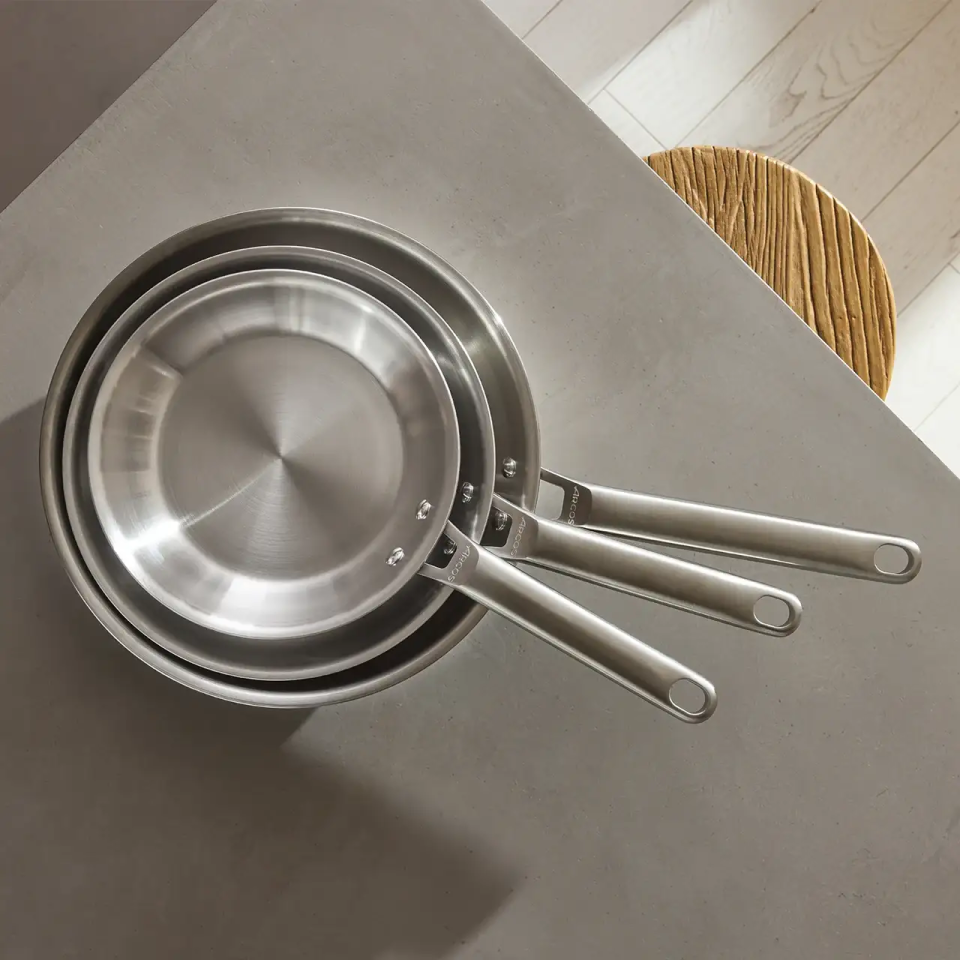 The ultimate set for healthy and long-lasting cooking. Three tri-ply stainless steel pans —20, 26 and 30 cm— PFAS-free, non-coated and compatible with induction, oven and grill.