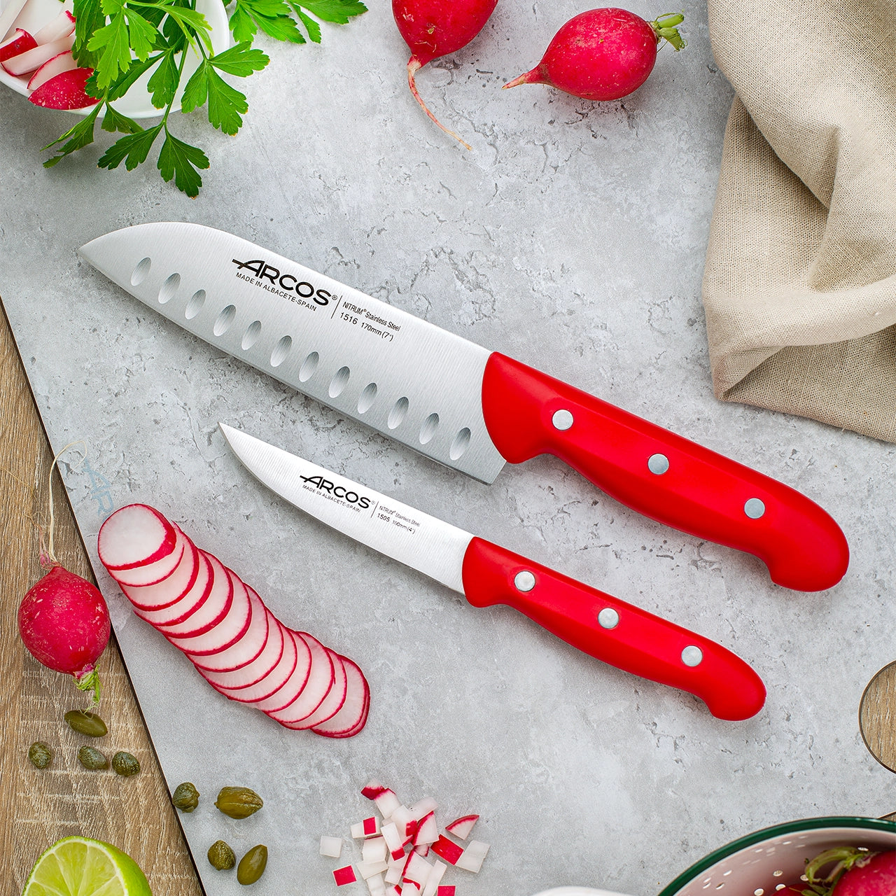 - The Arcos knife set includes the 170mm Santoku Knife and the 100mm Paring Knife, two essential pieces for your kitchen utensil collection.