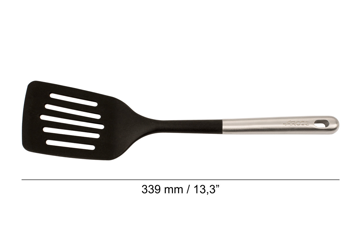 Resistente al calor y perfecta para voltear, servir y manipular alimentos. Su diseño ranurado permite escurrir líquidos con facilidad.