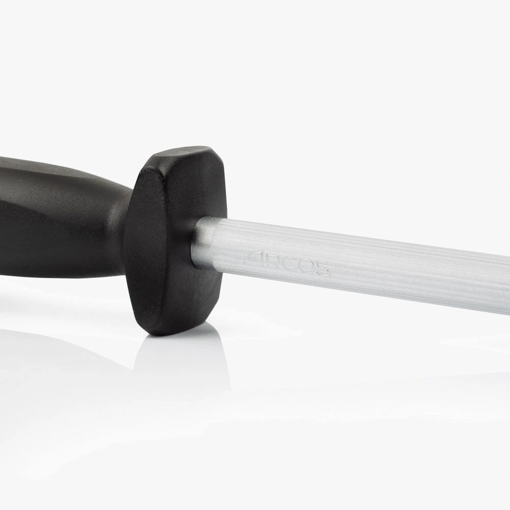 Chromed carbon steel sharpening steel with black polypropylene handle, ideal for sharpening your knives in aprofessional way.