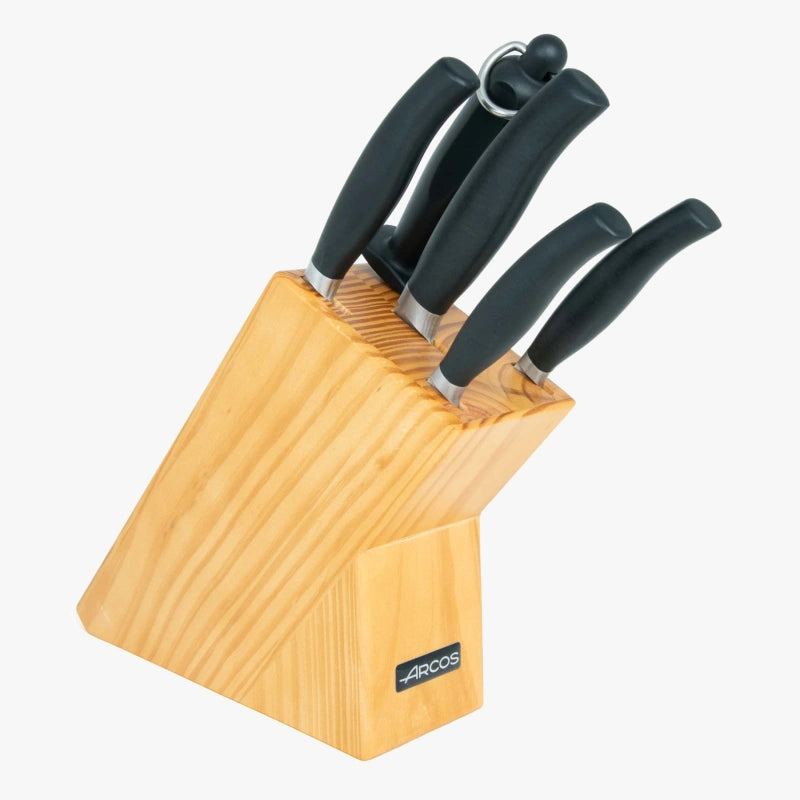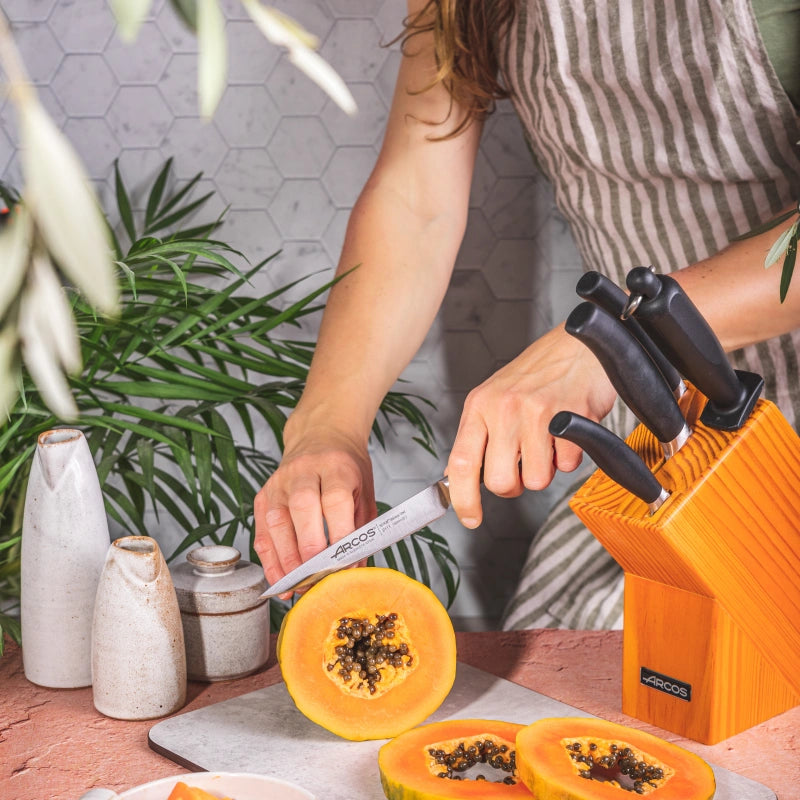 Le set de cuisine de 4 pièces de la série Clara + bloc + fusil comporte des couteaux qui ont été forgés en Espagne par des experts du secteur.