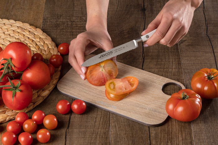 El juego Riviera Blanc consta de un Cuchillo Tomatero de 130 mm y un Cuchillo Santoku de 140 mm. También incluye un par de tijeras de cocina de acero inoxidable NITRUM, con mangos de polipropileno, y una tabla de corte de resina fenólica y fibra de policelulosa.