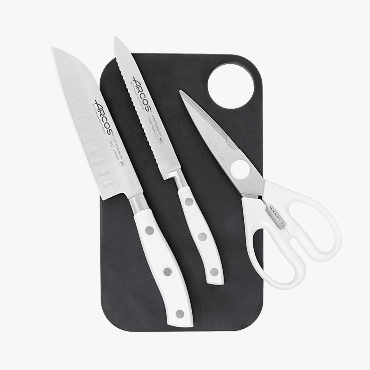 El juego Riviera Blanc de Arcos es un práctico set de cuchillería y tijeras de cocina con tabla de corte.