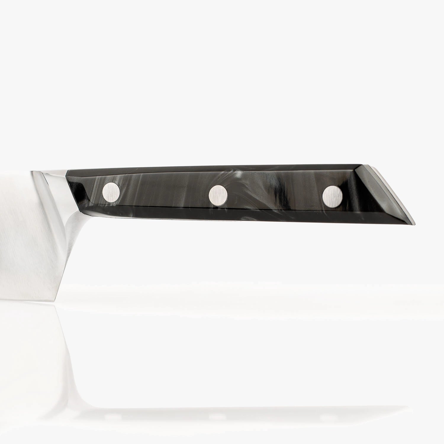 - Design du manche en acrylique noir nacré, avec des motifs uniques qui rendent chaque couteau une pièce unique.