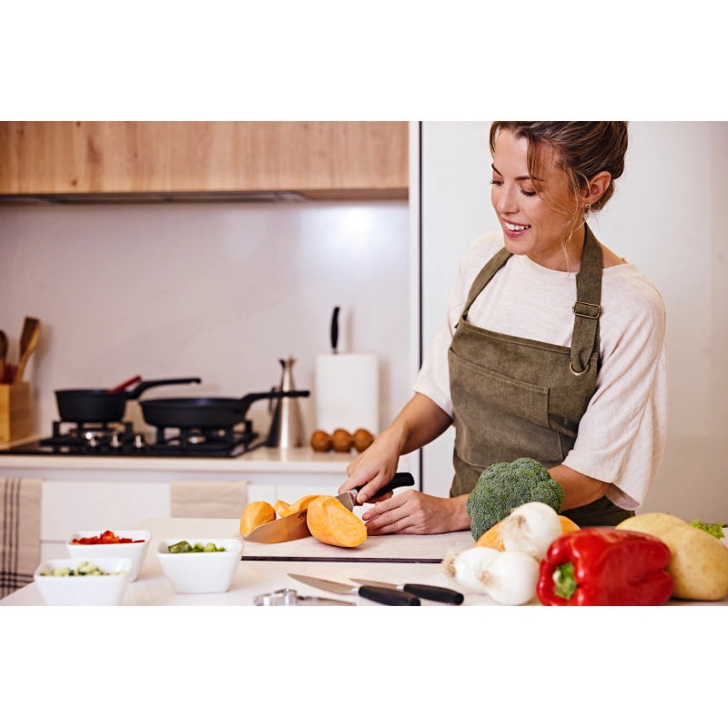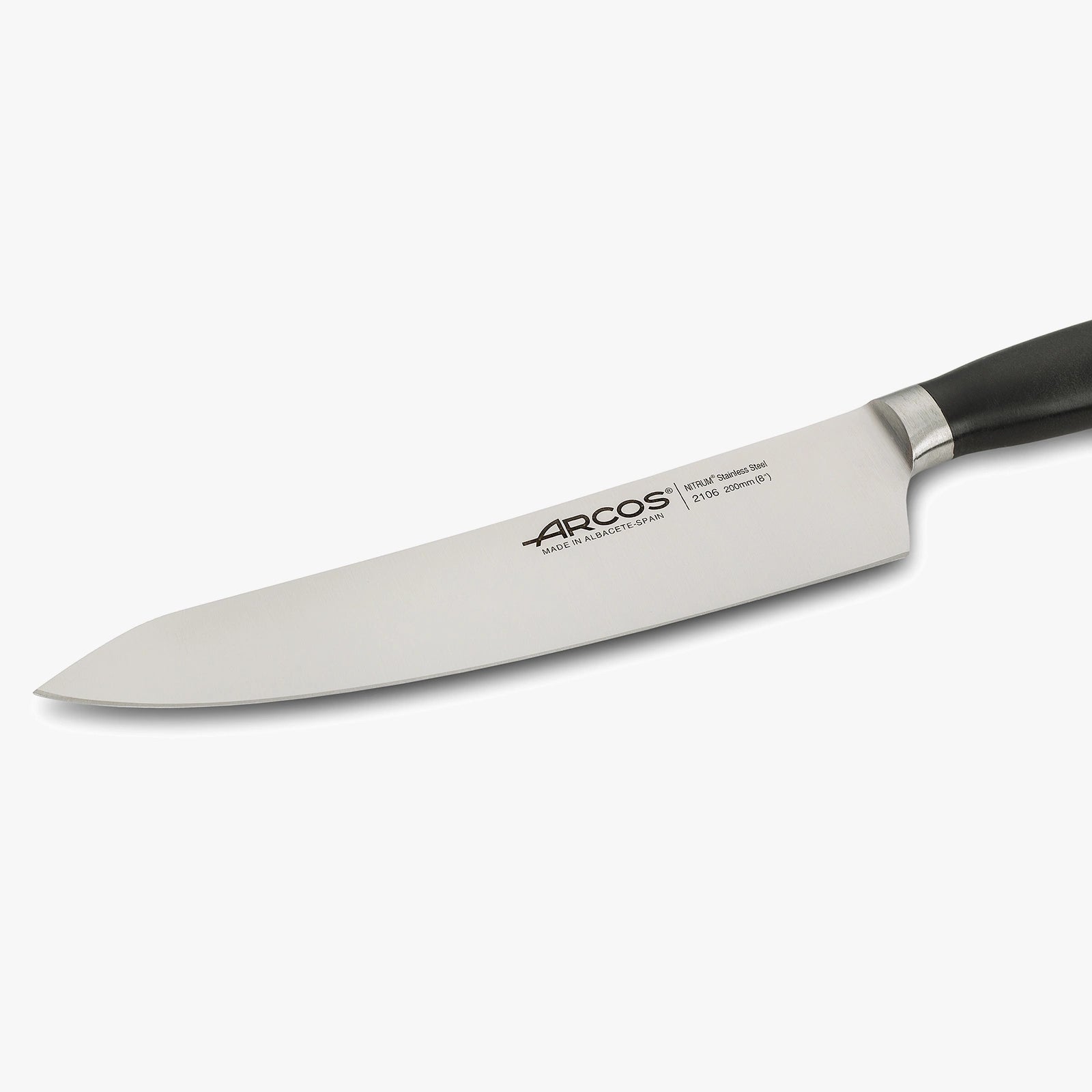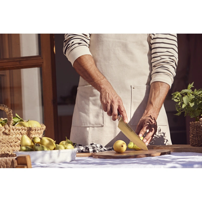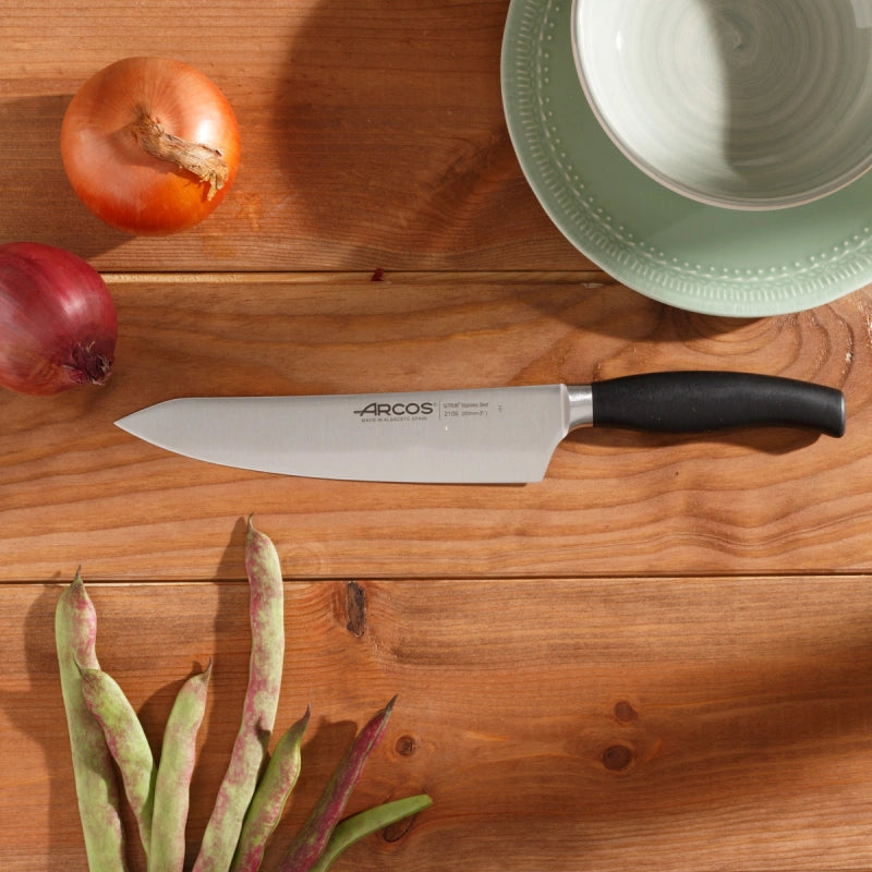 Couteau cuisine de 200 mm, 100% forgé d'une seule pièce, sans aucune soudure. Fabriqué en acier inoxydable NITRUM®. Notre formule d'acier à l'azote, donne à la lame une plus grande dureté, meilleur pouvoir de coupe et une meilleure durabilité du fil.