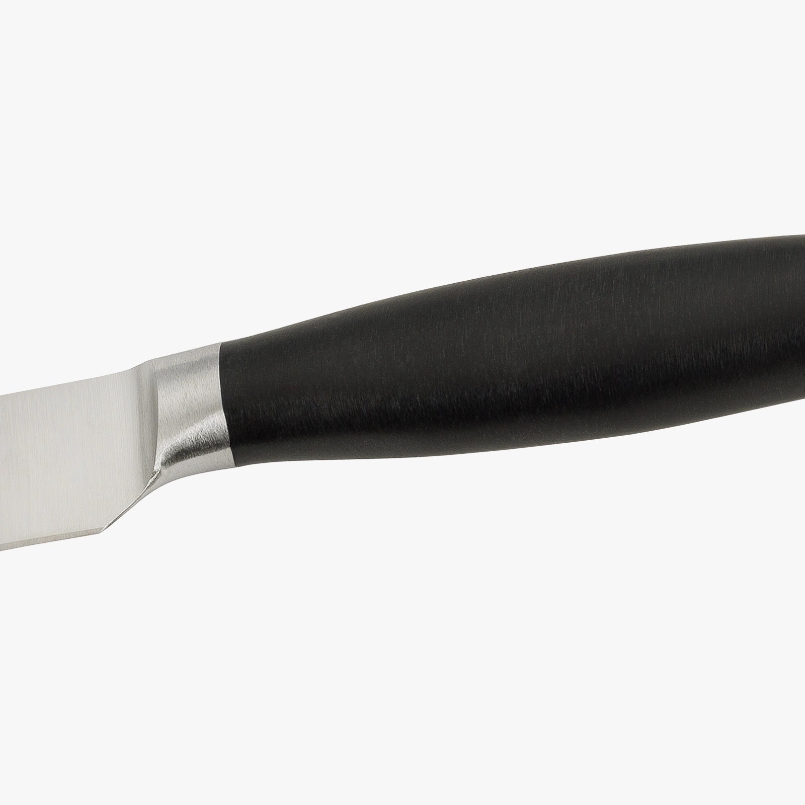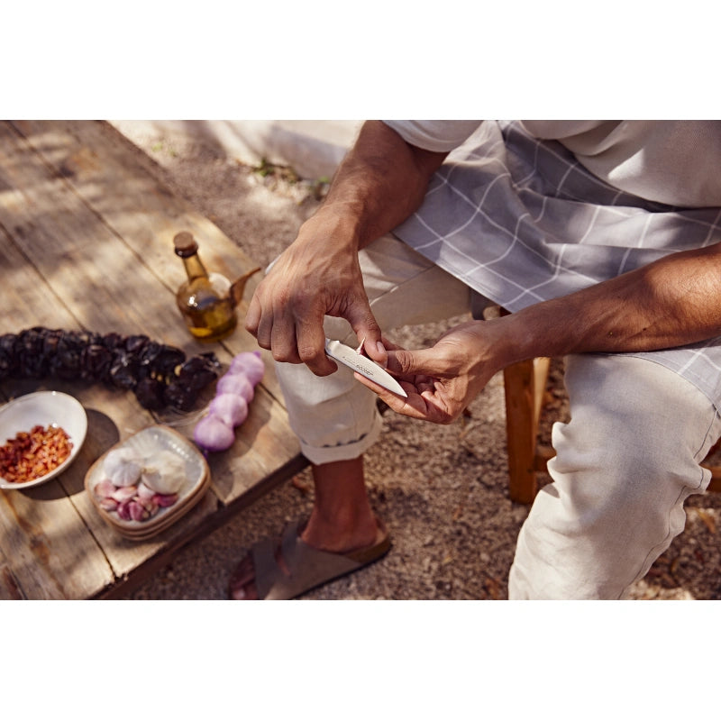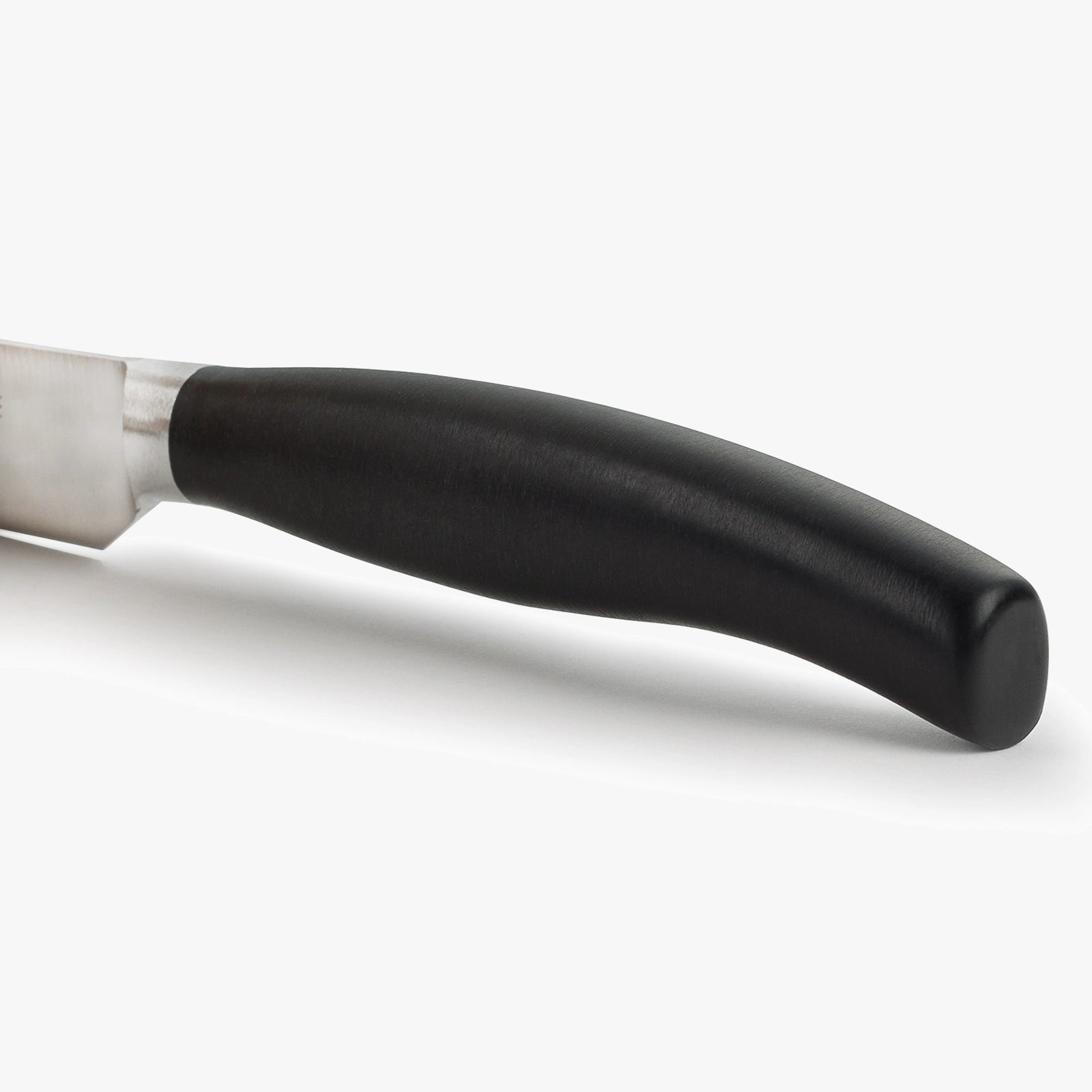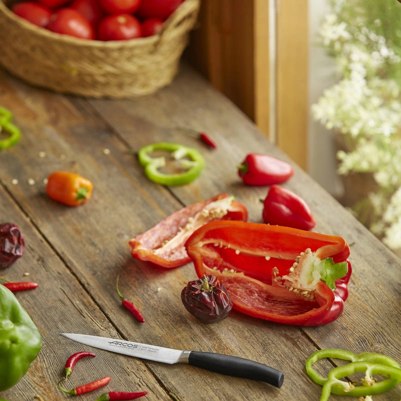 Couteau légumes de 130 mm, forgé d'une seule pièce, sans aucune soudure. Composé d'acier NITRUM, notre formule d'acier à l'azote, il donne à la lame une plus grande dureté, un plus grand pouvoir de coupe et une meilleure durabilité du fil, réduisant et facilitant l'entretien