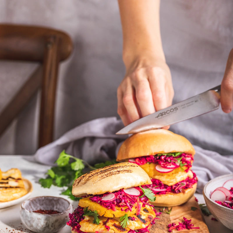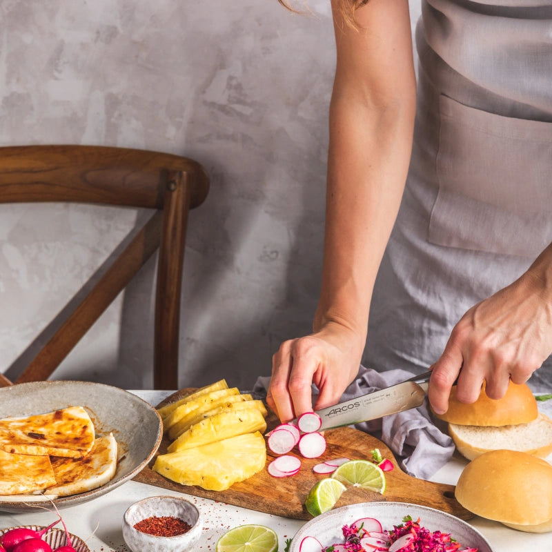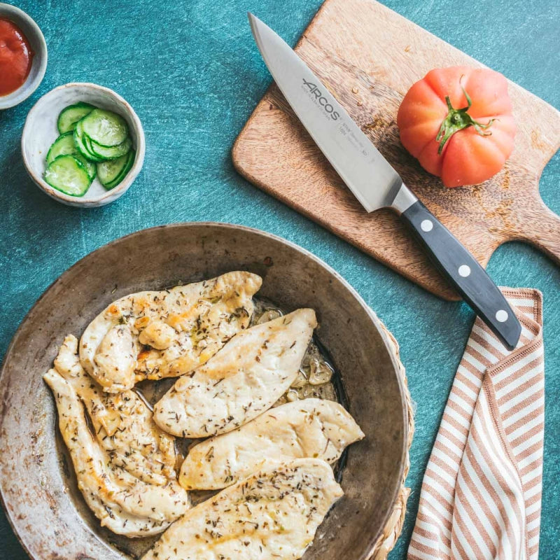 - Lame large de 150 mm, avec un tranchant "Silk Edge", forgée à Albacete avec de l'acier inoxydable NITRUM® dont la formule exclusive d'Arcos lui confère une plus grande fermeté et précision de coupe, ainsi qu'une plus grande durabilité.