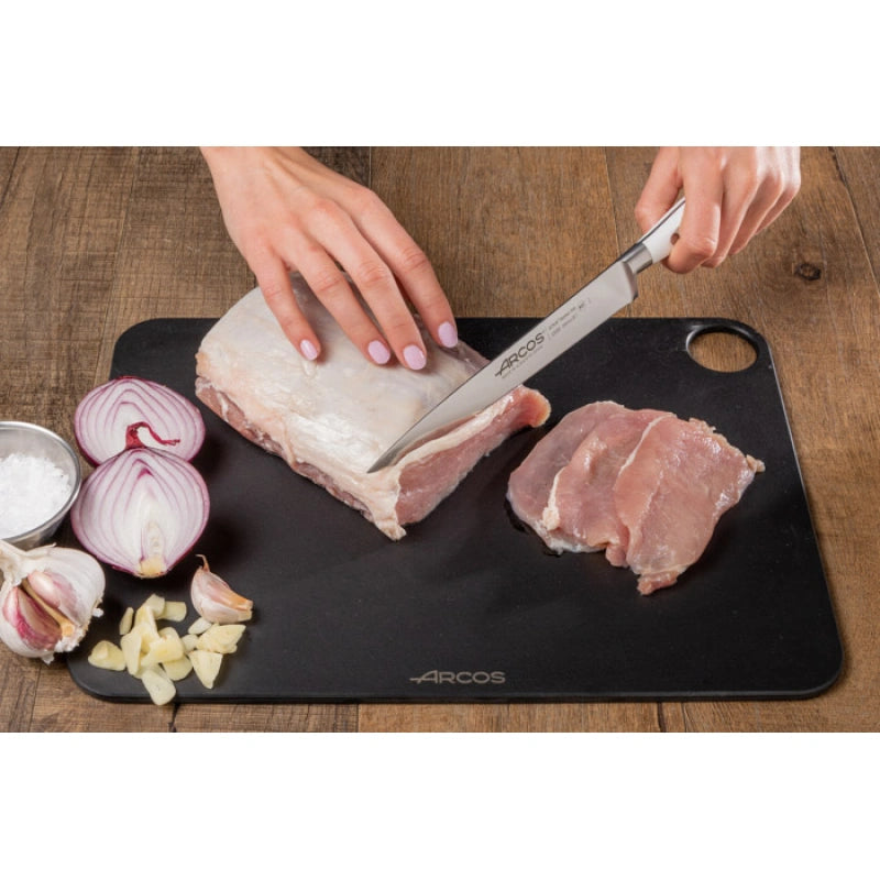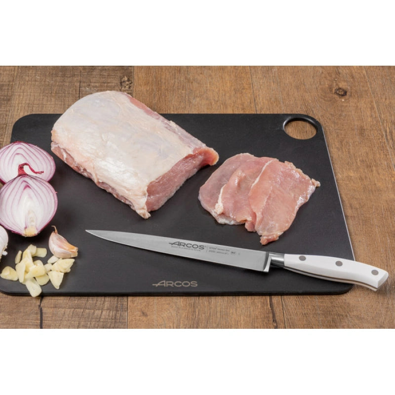 Le couteau à découper Rivera Blanc Arcos, aussi appelé couteau \"à trancher\", se distingue non seulement par sa lame longue et robuste, mais aussi par sa grande durabilité et son excellente efficacité de coupe. Il vous permettra de découper la viande et le poisson, rapidement et en toute sécurité.