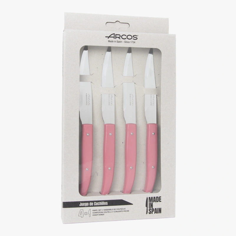 Le coffret de 4 couteaux à steak avec manche rose de 110 mm d'Arcos vous permet de couper tout type de viande de la plus crue à a plus cuite