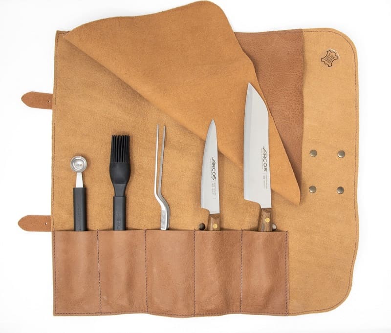 - El estuche de piel que guarda los utensilios permite un suave tacto por su material de fabricación moderno y con textura sutil.