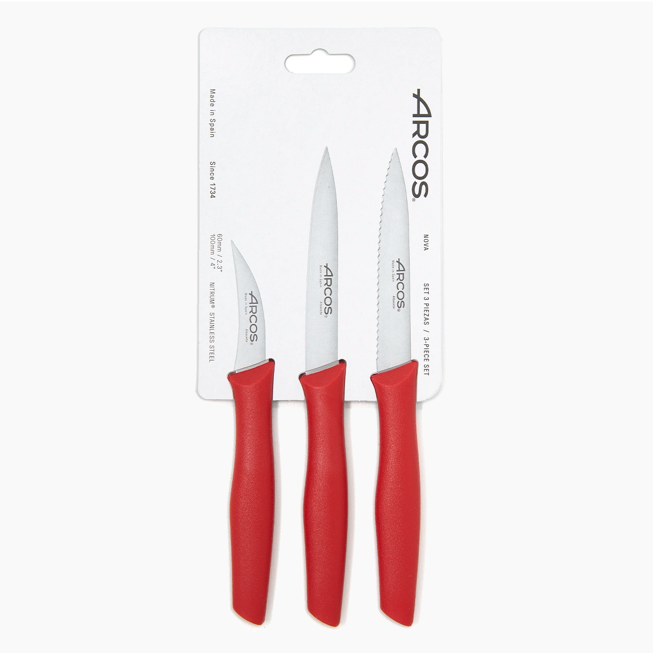 Set de 3 couteaux office lame lisse, crantée et éplucheur rouge Nova