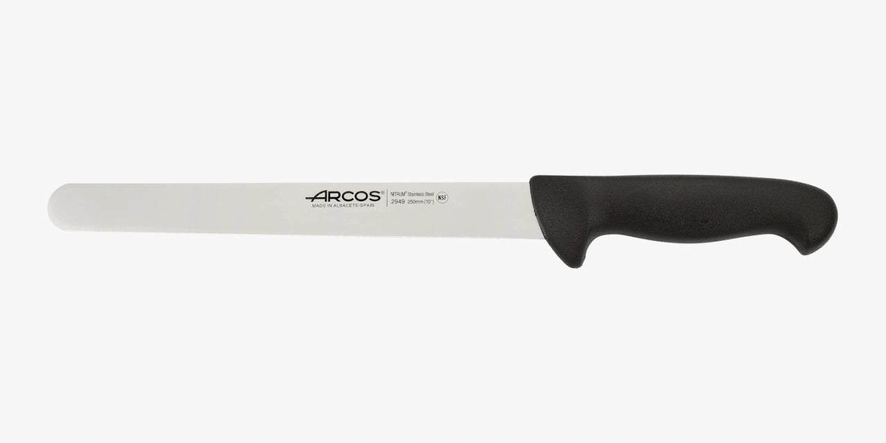 Il coltello per affettare della serie 2900 da 250 mm in nero è composto da una lama sottile e flessibile per affettare fette di salumi.