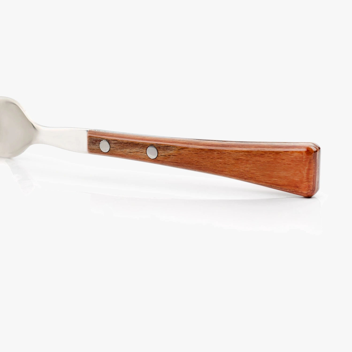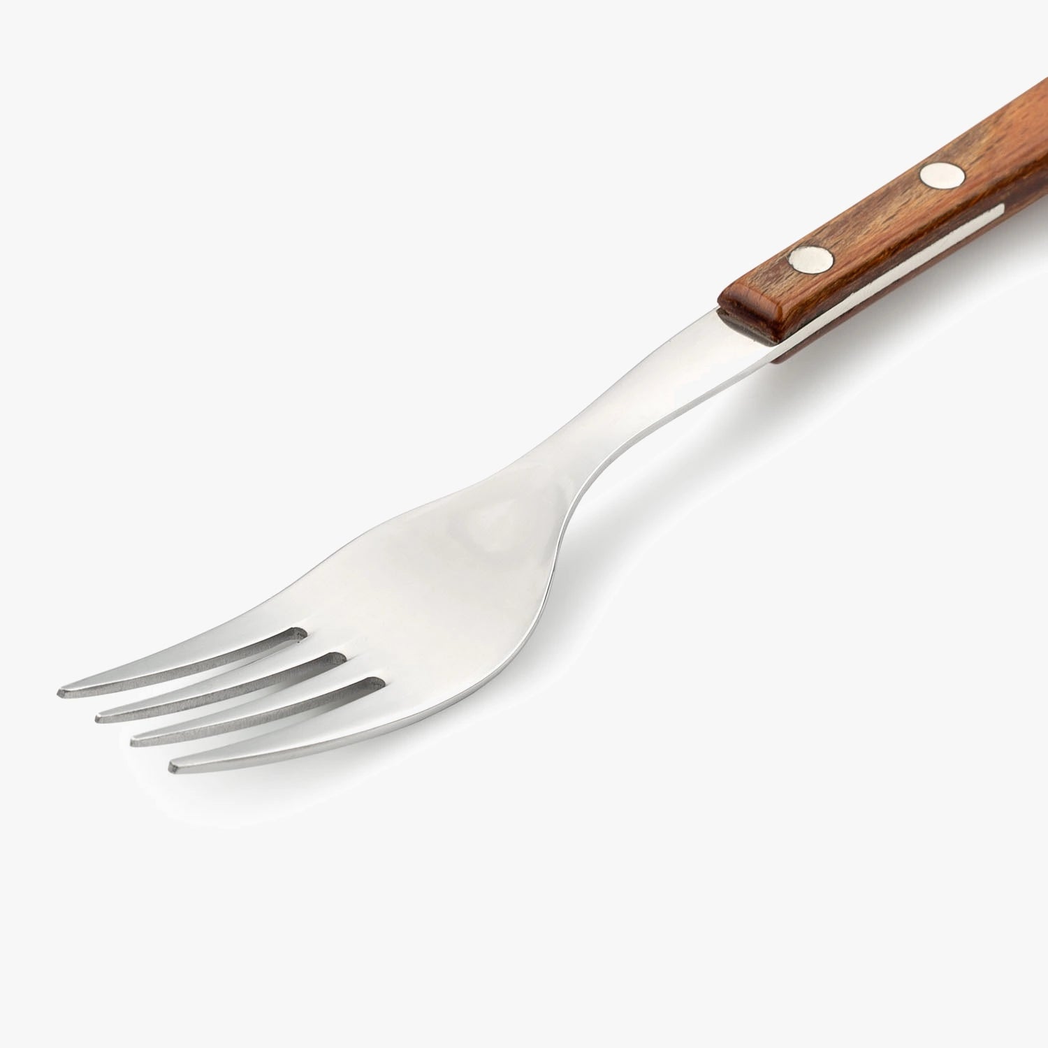 - Manico Ergonomico: Progettato con un manico in legno di faggio compresso, questa forchetta offre una presa sicura e aggiunge un tocco di calore e autenticità alla tua posateria.