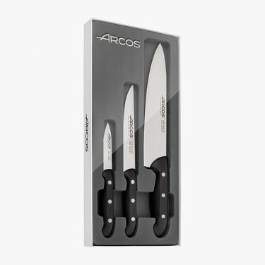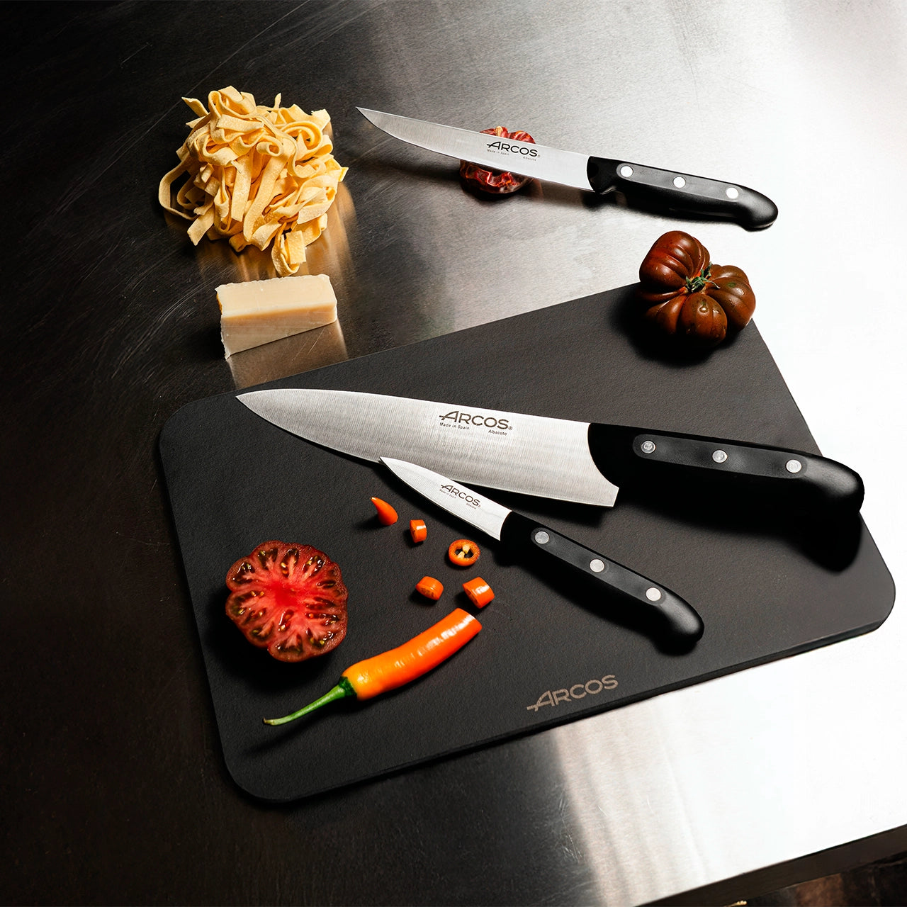 Il Set di 3 coltelli Basic di Arcos include un coltello spelucchino da 80 mm, un coltello da cucina da 150 mm e un coltello da cuoco da 215 mm, ideali per pulire, sbucciare e tagliare una vasta gamma di frutta, verdura e qualsiasi altro tipo di alimento.