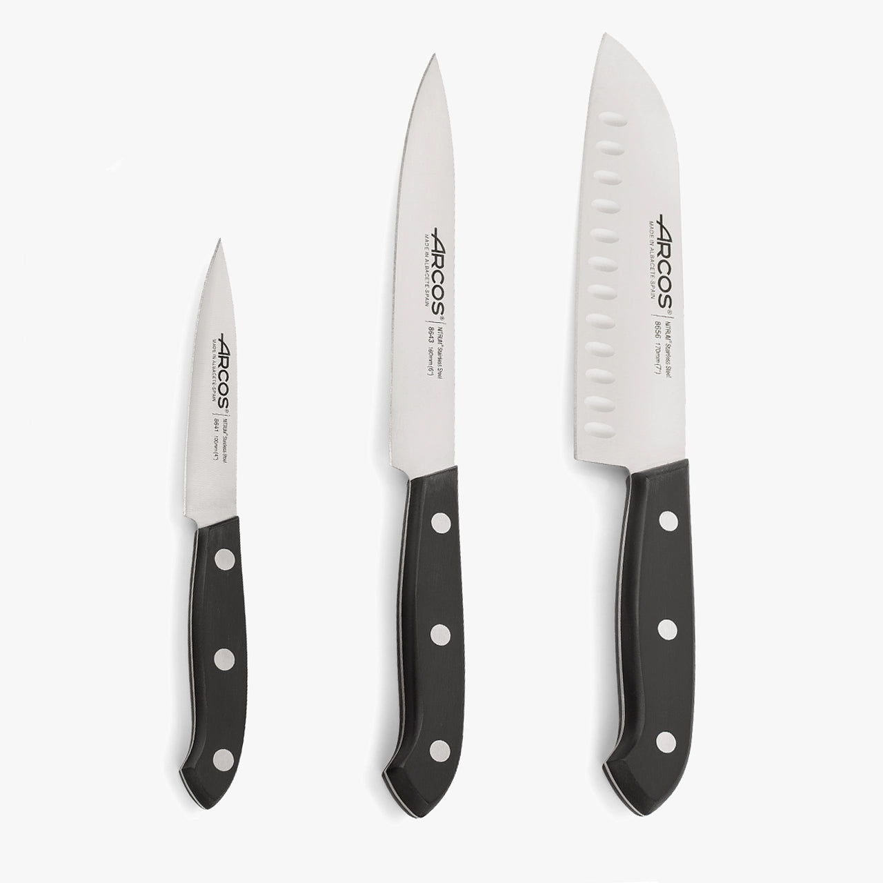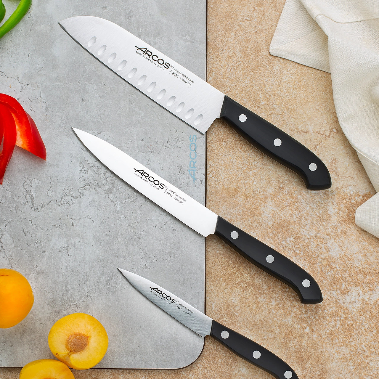 Il Set 3 Coltelli Versatile include un coltello per sbucciare (100 mm), un coltello da cucina (160 mm) e un coltello santoku (170 mm). Con lame in acciaio inossidabile NITRUM® e manici in poliossimetilene, questo set offre durata, resistenza alle alte temperature e tagli precisi.