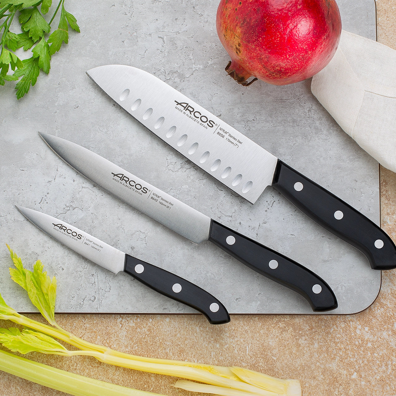 - Versatilità in cucina. Il coltello per sbucciare è ideale per pelare e tagliare frutta e verdura, il coltello da cucina per compiti generali e il coltello santoku per tagli precisi e delicati.