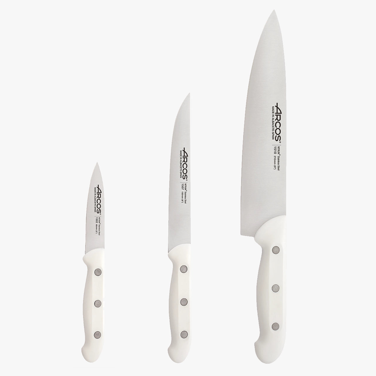 Il Set di Coltelli White Basic di Arcos riunisce tre strumenti essenziali per qualsiasi cucina: un coltello spelucchino da 80 mm, un coltello da cucina da 150 mm e un coltello da cuoco da 215 mm. Progettati e fabbricati da esperti a Albacete, questi coltelli combinano tradizione e tecnologia avanzata per offrire un'esperienza di taglio superiore.