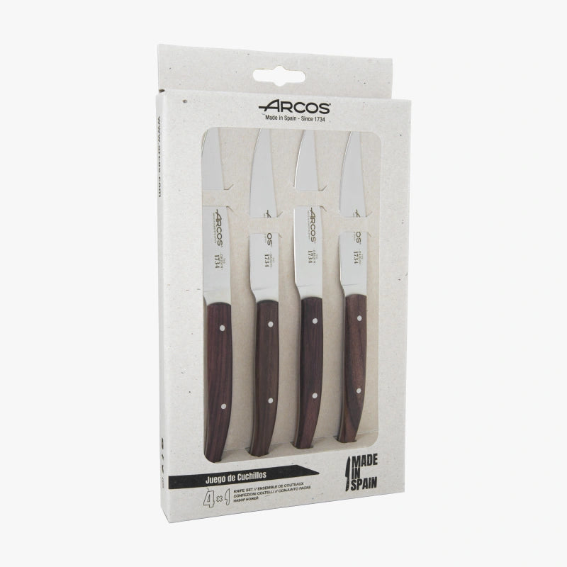 Il set di 4 pezzi Coltelli Bistecca The Origin Manico in Legno di Palissandro è realizzato per portare eleganza e tradizione alla tavola. Hanno una lama in acciaio inossidabile da 110 mm e un filo liscio che facilita il taglio e la tranciatura delle carni arrosto senza difficoltà. Hanno la forma curva e caratteristica di un coltello pieghevole. Inoltre, sulla lama di ogni coltello è incisa la data 1734, come distintivo di ogni pezzo di Arcos. Tutti sono stati realizzati da mani esperte.