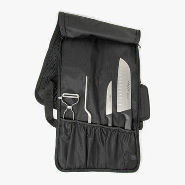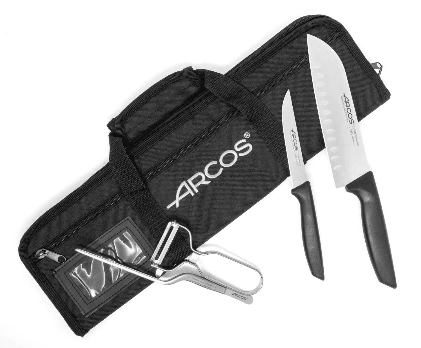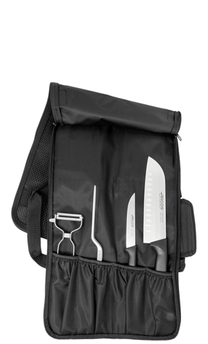 El set incluye: Bolsa cuchillos 4 piezas, Cuchillo Santoku Niza 180 mm, Cuchillo Verduras Niza 110 mm, Pinza emplatar y Pelador.