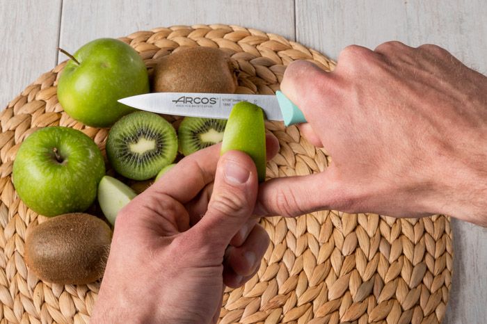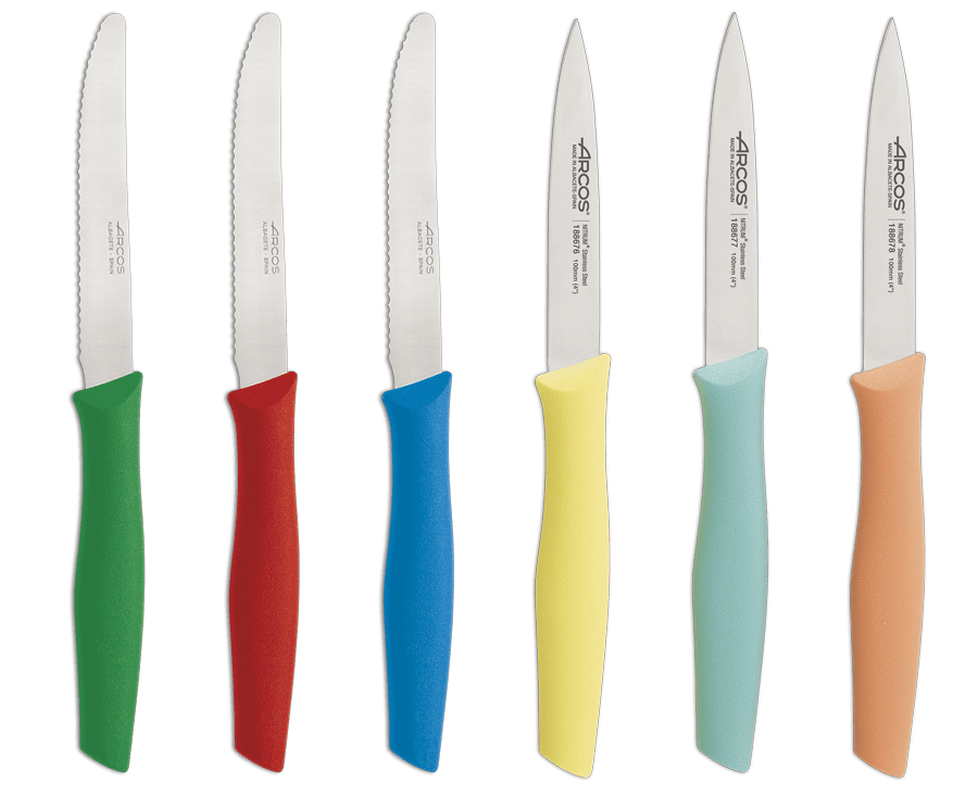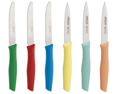 El juego de mondadores Arcos consta de tres cuchillos de mesa y tres cuchillos mondadores de frutas y tubérculos. Presentan un cuerpo de acero inoxidable NITRUM® y mangos de polipropileno. Este set de cuchillos está disponible en seis atractivos colores.