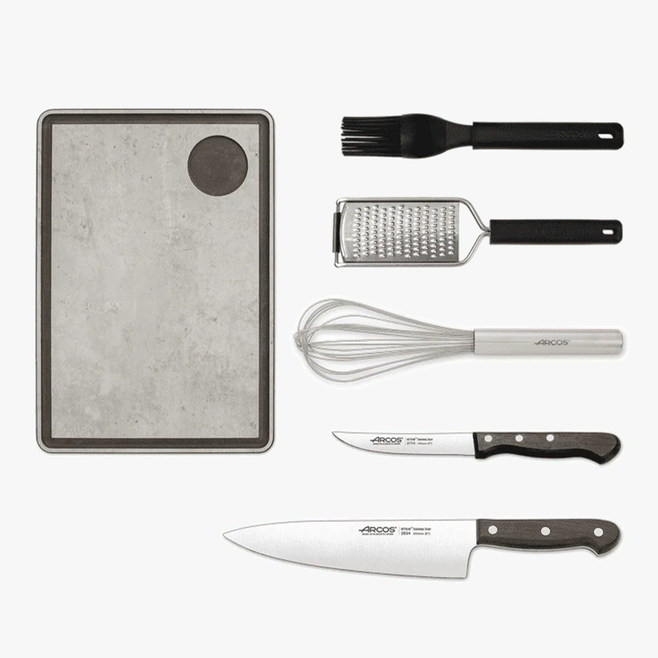 El set gadgets y cuchillos está compuesto por un cuchillo de verduras Atlántico, un cuchillo cocinero Atlántico, un rallador pequeño, una batidora de varillas en acero inoxidable, una brocha pastelera y una tabla elaborada en resina fenólica y fibra de celulosa con medidas de 33x23 cm.