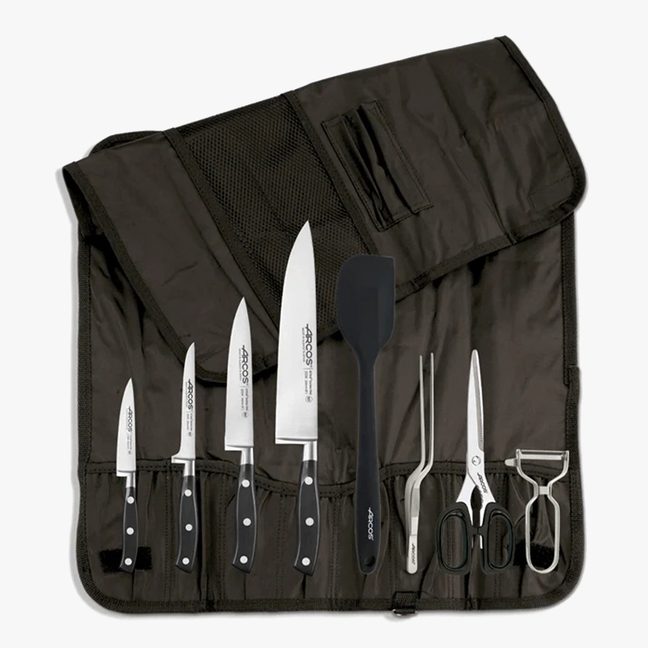 El Set profesional de hostelería serie Riviera ofrece 4 cuchillos de acero inoxidable NITRUM y accesorios esenciales en una bolsa de cuhillos de 8 piezas. Ideal para chefs y amantes de la cocina que buscan calidad y precisión.