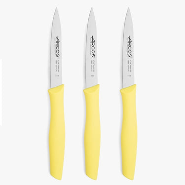 Set di 3 coltelli spelucchino della serie Nova con lame in acciaio inossidabile NITRUM da 100 mm e manico ergonomico di colore limone. Serie Nova di Arcos.