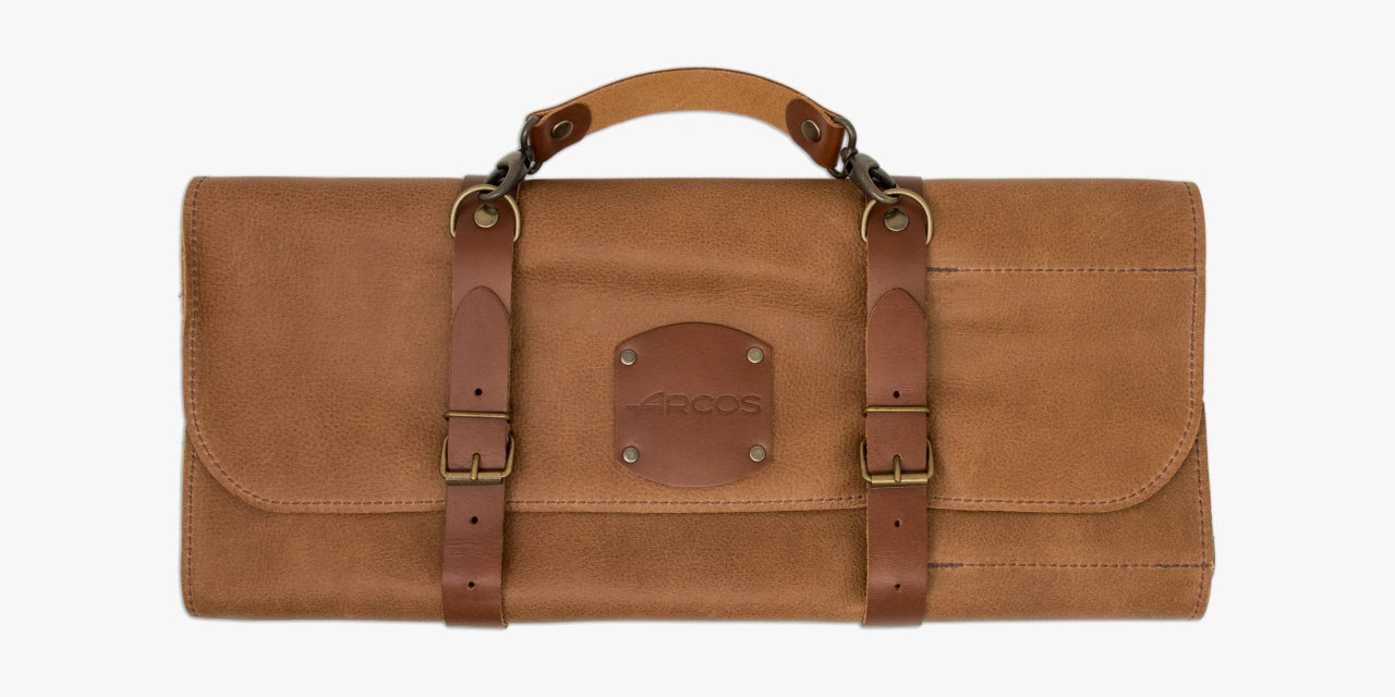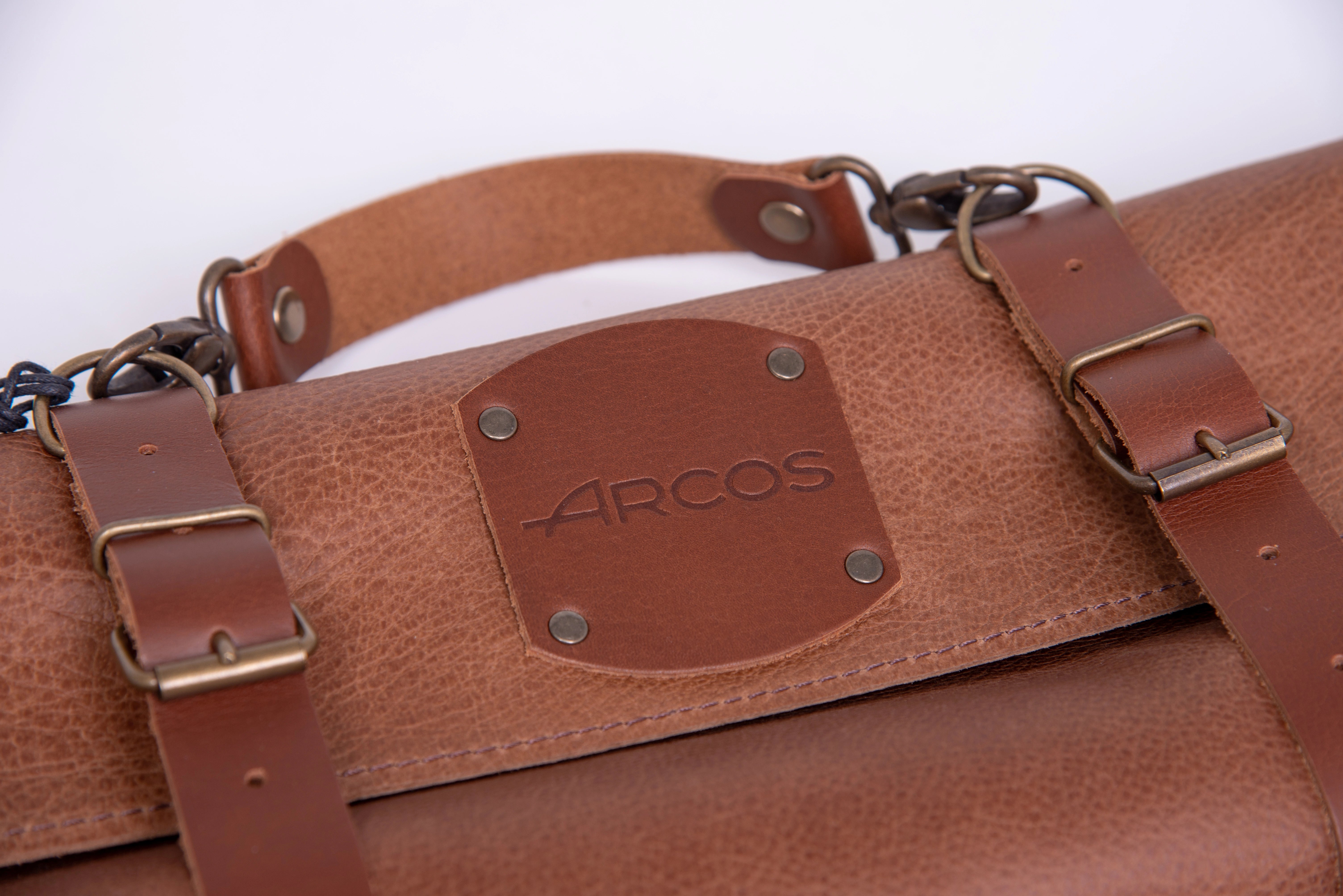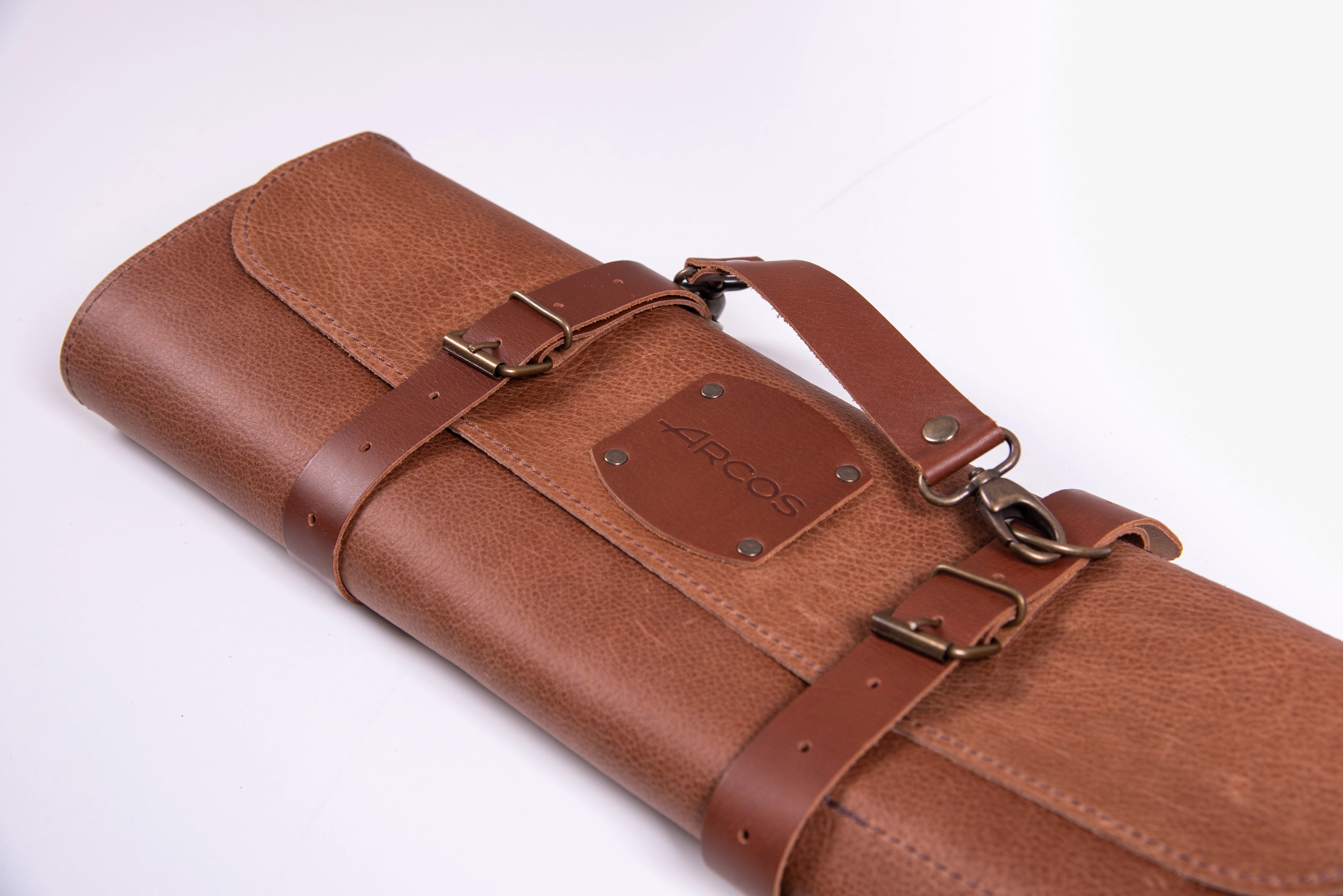 La bolsa de cuchillos Arcos de piel y herrajes metálicos con capacidad para 10 piezas es el complemento ideal para el profesional de la gastronomía que ama el buen gusto. Cuenta con un tacto suave que te permitirá llevar tus utensilios de cocina de manera cómoda.