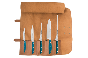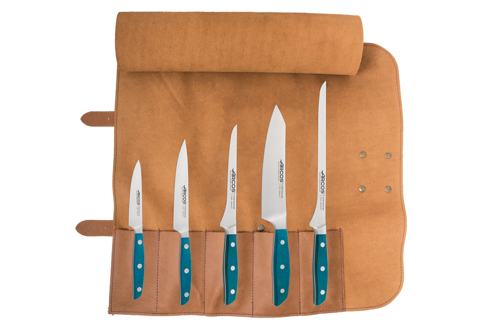 La bolsa de piel y 5 cuchillos de la serie Booklyn de Arcos es un set muy práctico para trasladar dichos utensilios.