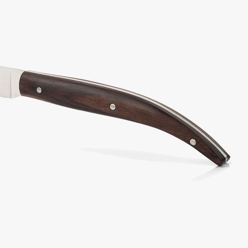 - Cuenta con un mango elaborado de madera de palisandro e incorpora remaches machihembrados de acero inoxidable.