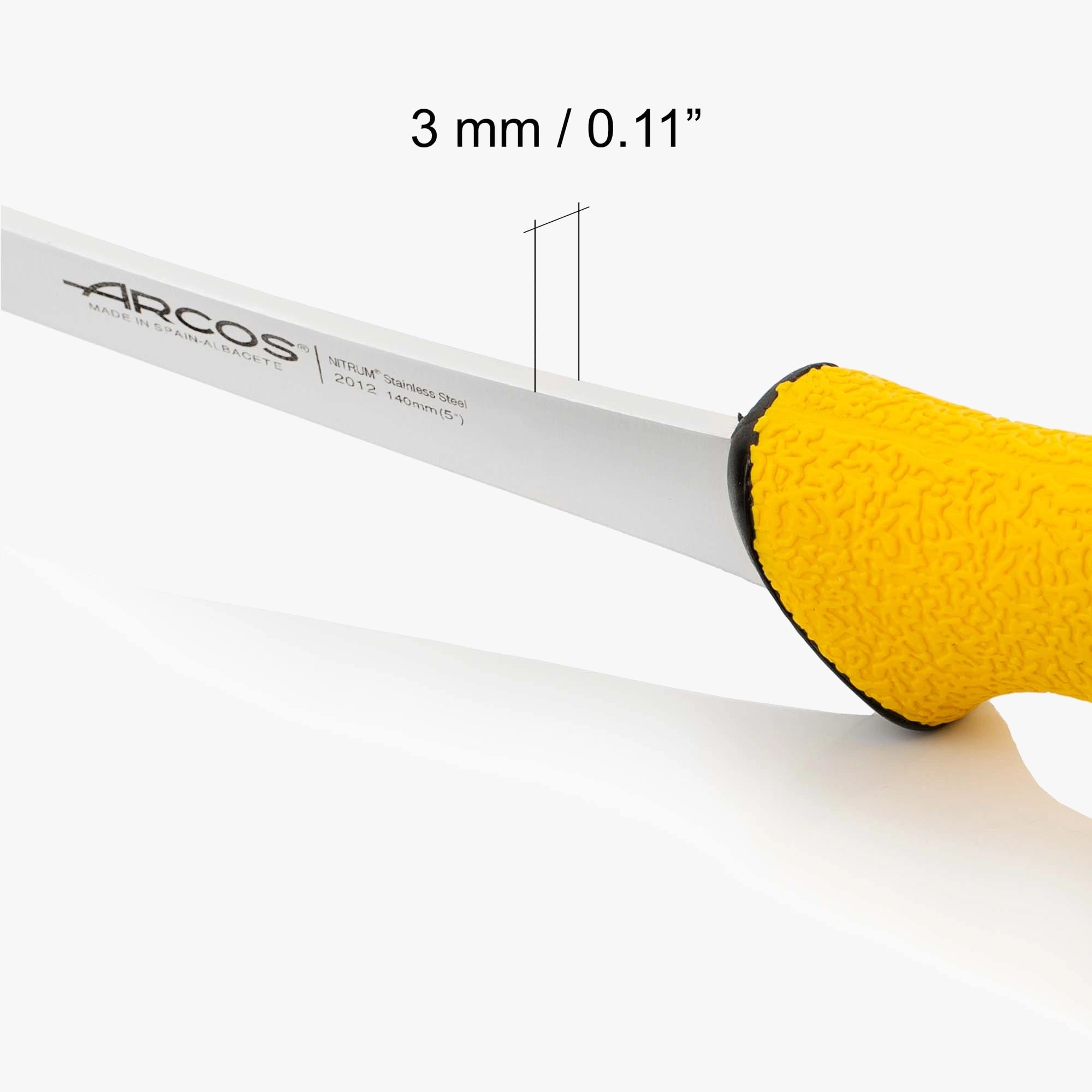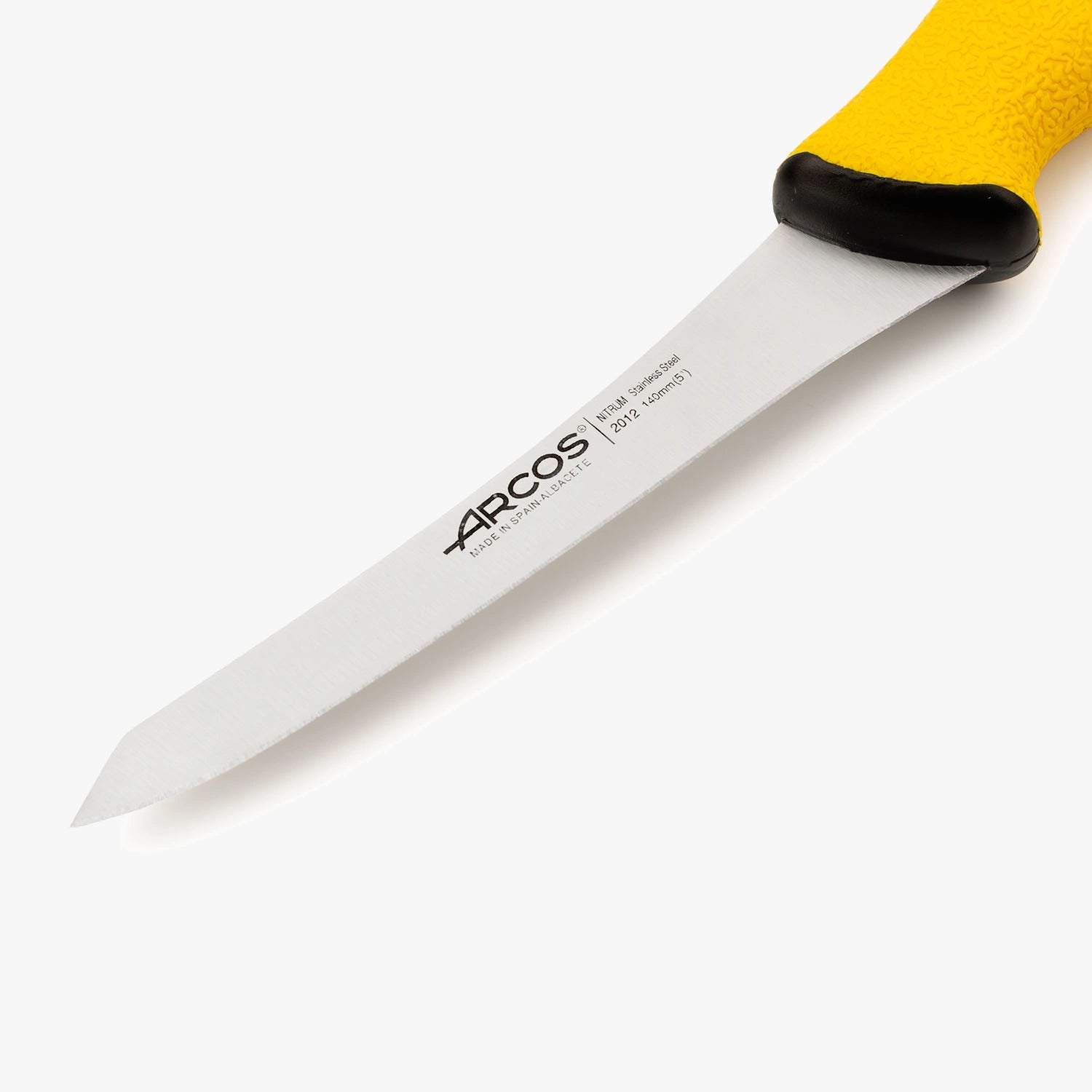 El Cuchillo Deshuesador Rígido Serie Duo Pro de Arcos, con punta biselada y hoja de acero NITRUM® de 140 mm, ofrece seguridad, precisión, y ergonomía con mango antideslizante y tecnología antibacteriana.