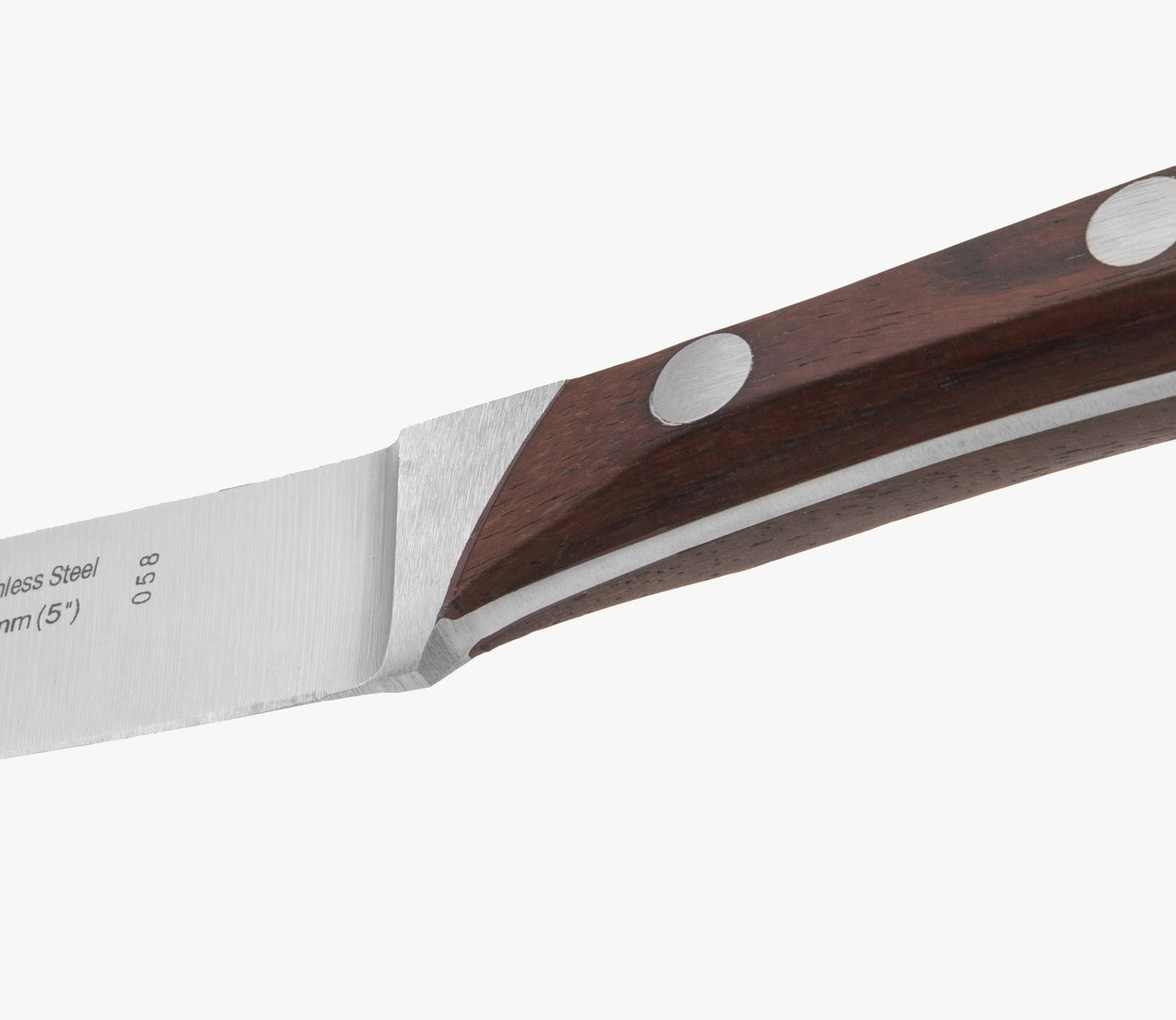 El cuchillo verduras de la serie Natura tiene una potente hoja de acero inoxidable Nitrum® de 125 mm y mango de madera de palisandro.