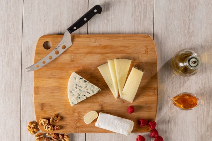 - Cuchillo de queso universal con una hoja de 140 mm. Se adapta facilmente a quesos de mayor consistencia gracias a sus perforaciones circulares, que evitan que los trozos rebanados se queden pegados.