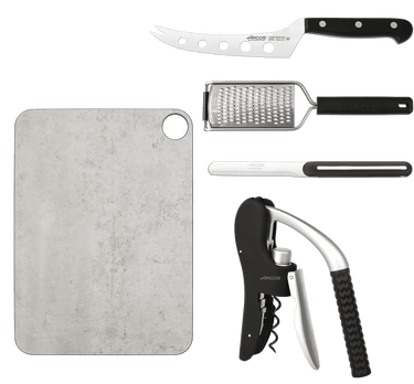 Juego de cuchillos, rallador, tabla de cortes y sacacorchos ideales para una celebración especial con amigos o con la familia.