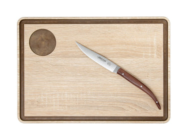 Set de cuchillo Arcos chuletero modelo The Origin. Incluye una tabla para corte y un cuchillo estilo navaja de diseño especial.