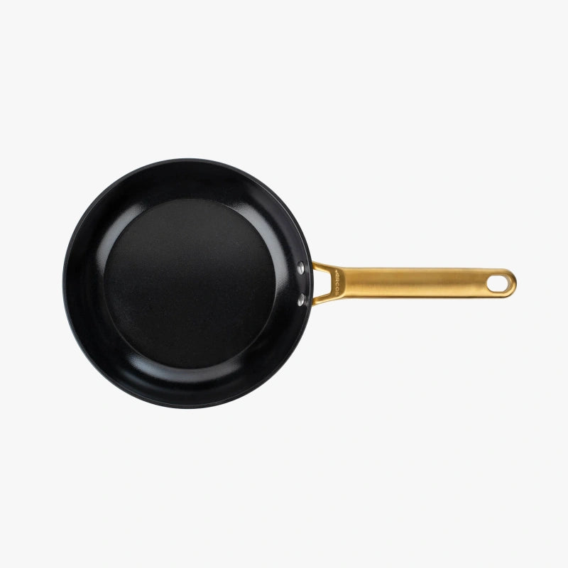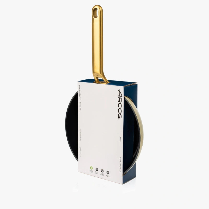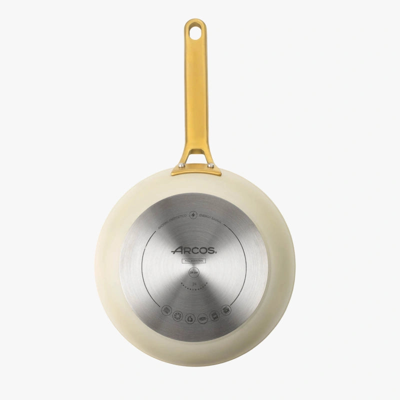 La sartén antiadherente Samoa Iconic de Arcos, de 24 cm, ofrece un cuerpo ligero de aluminio forjado y un revestimiento cerámico saludable. Su diseño beige con mango dorado aporta elegancia y eficiencia.