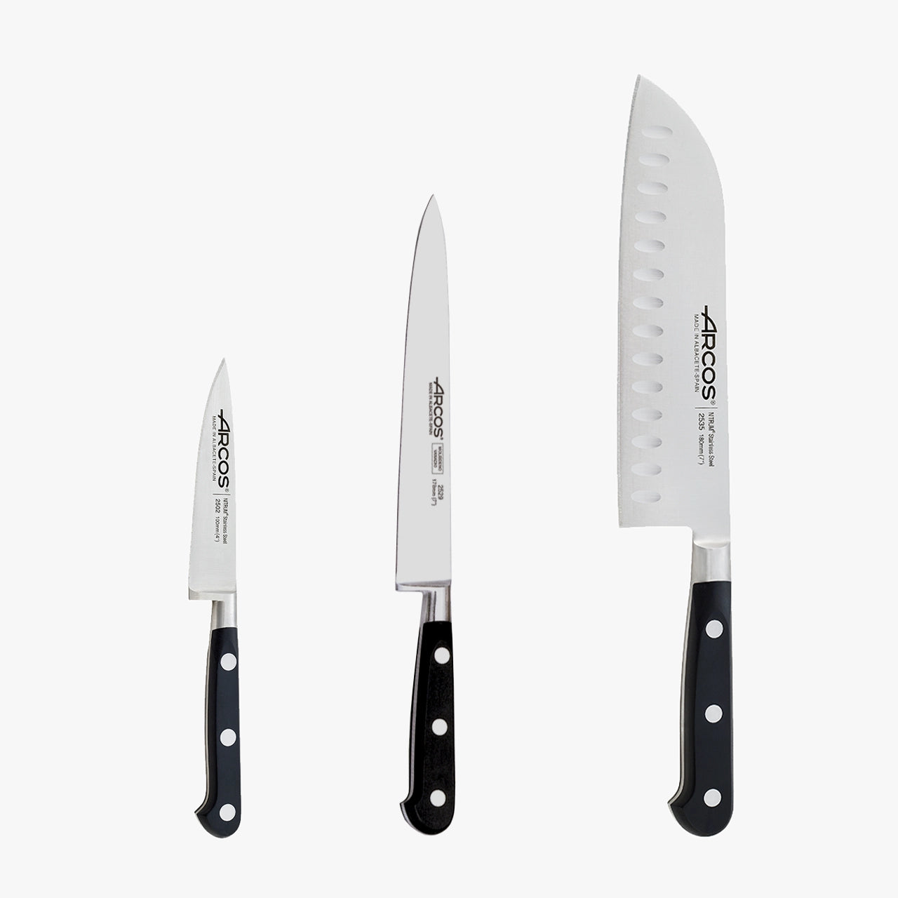 El Set 3 cuchillos Chef Selection de Arcos es una excelente opción para cualquier cocina, cubriendo todas las necesidades esenciales. Incluye un cuchillo mondador de 100 mm, un cuchillo para lenguados de 170 mm y un cuchillo santoku de 180 mm, imprescindibles para cualquier tarea culinaria.