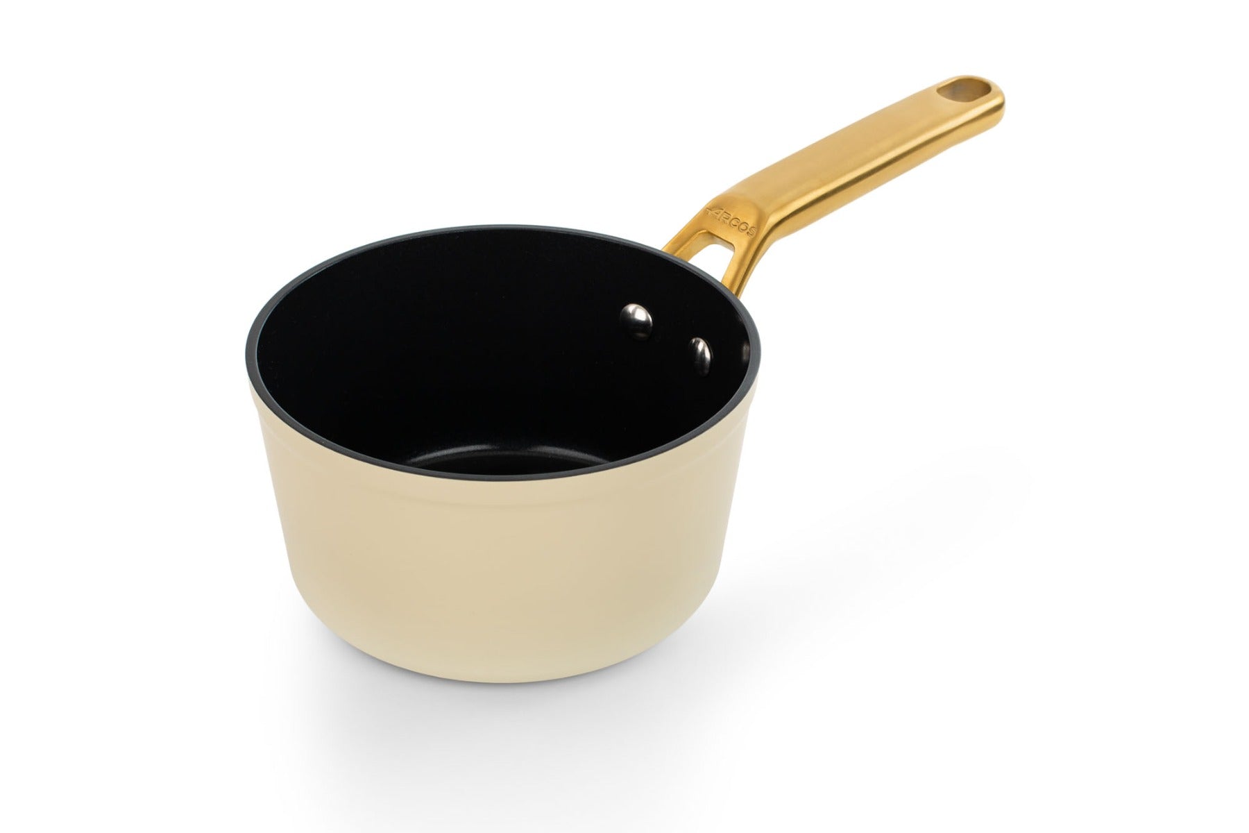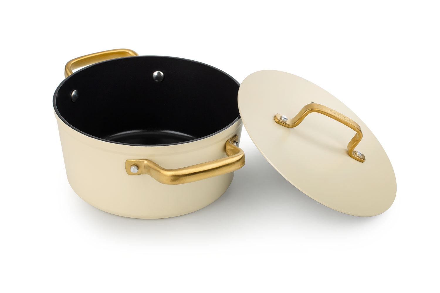 Juego de cocina Samoa Iconic compuesto por un cazo, una sartén y una cacerola, fabricados en aluminio forjado de alta calidad y con un revestimiento cerámico antiadherente en un elegante color beige.